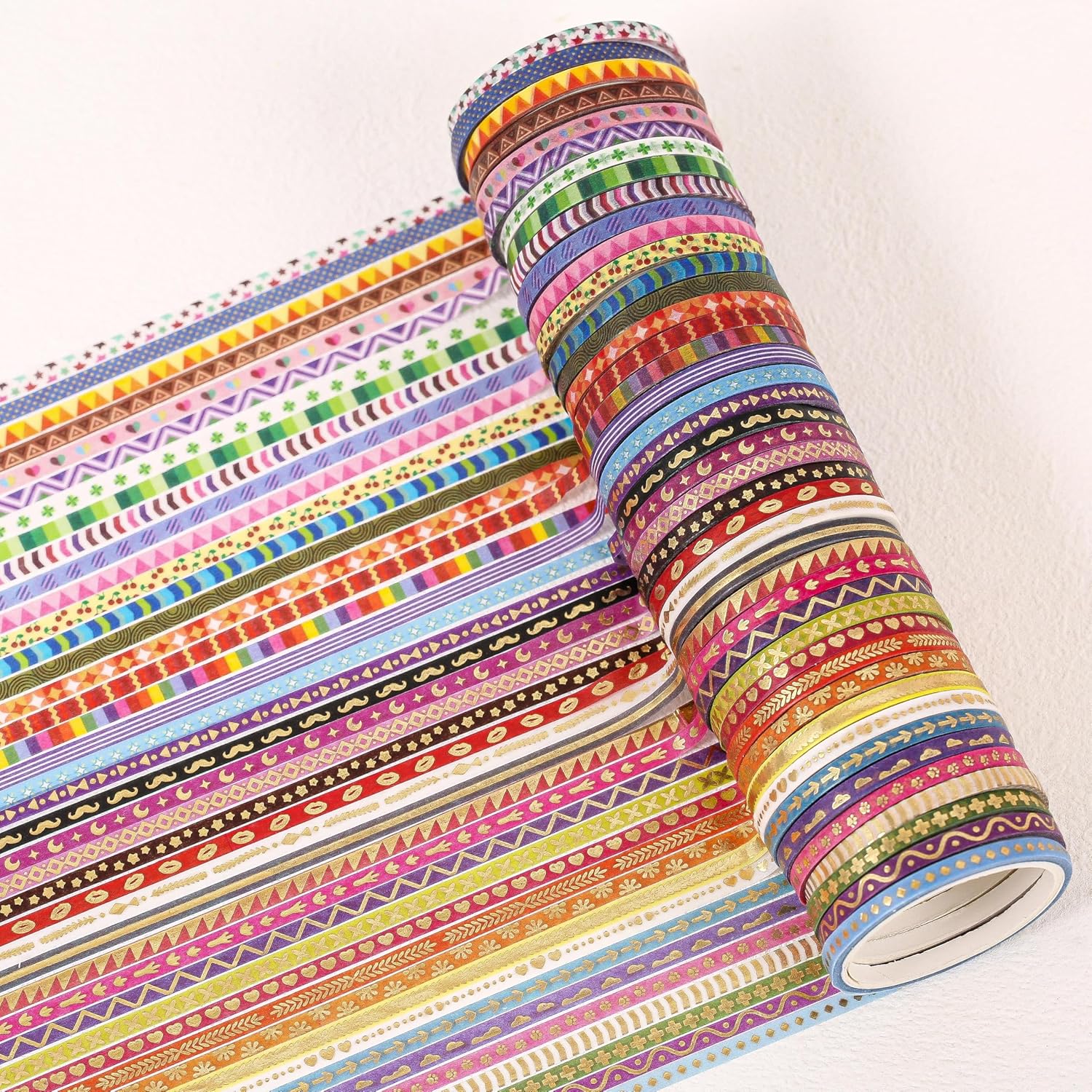 - This pack of 50 rolls, with 1/8" (3mm) in width and 10' (3m) in length. 25 rolls of them are with gold foiled. These different series and sufficient quantity washi paper stickers can meet your use and replacement.