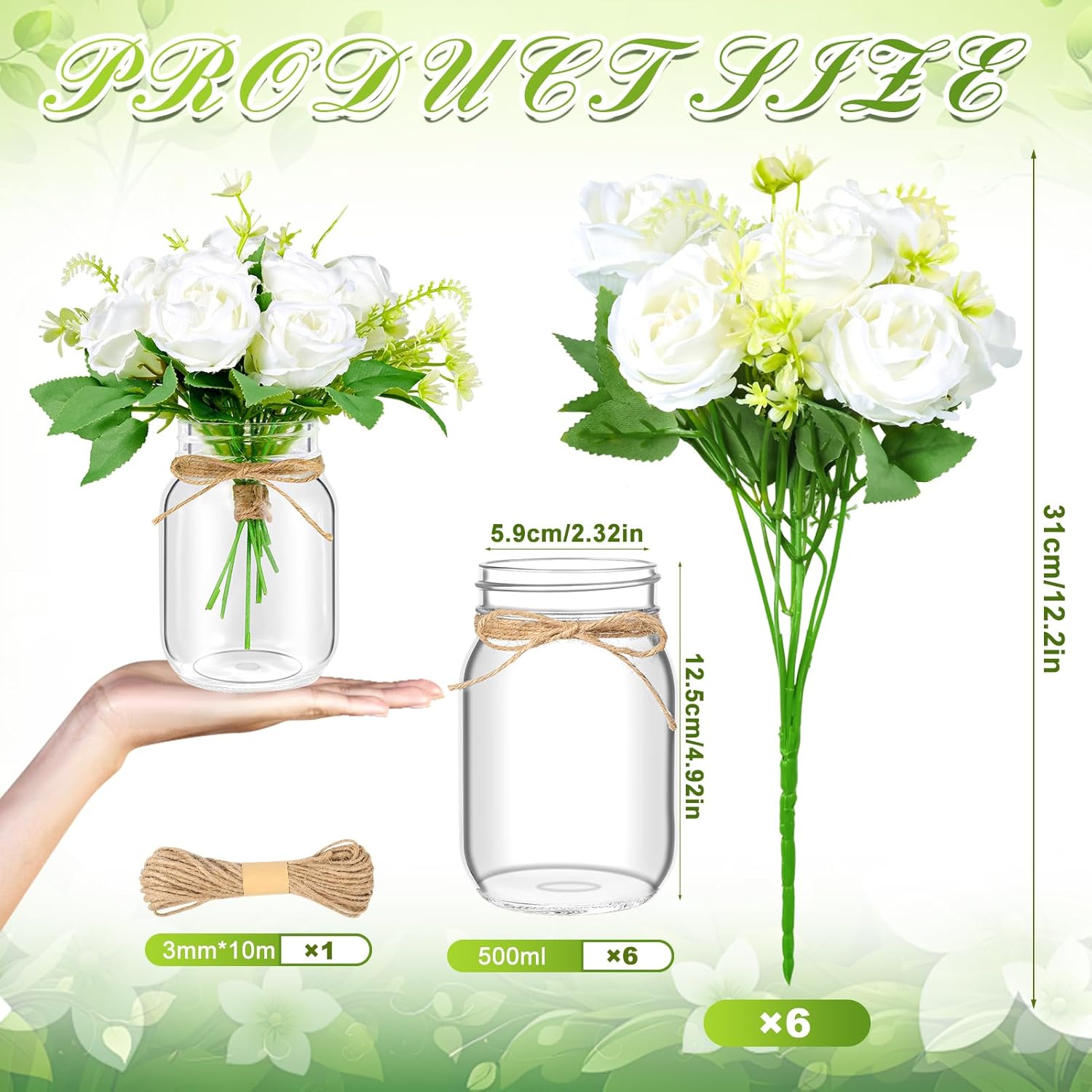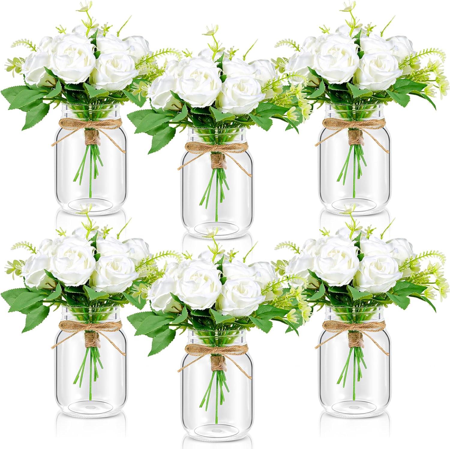 - 6 Set Mason Jar Table Centerpiece with Flower: Centerpiece table decorations includes 6 durable 17oz glass mason jars, 6 vibrant faux white rose stems, 10 meters of jute rope. Perfect for creating stunning center pieces decoration for table, wedding centerpieces for tables, or table centerpieces for party event
