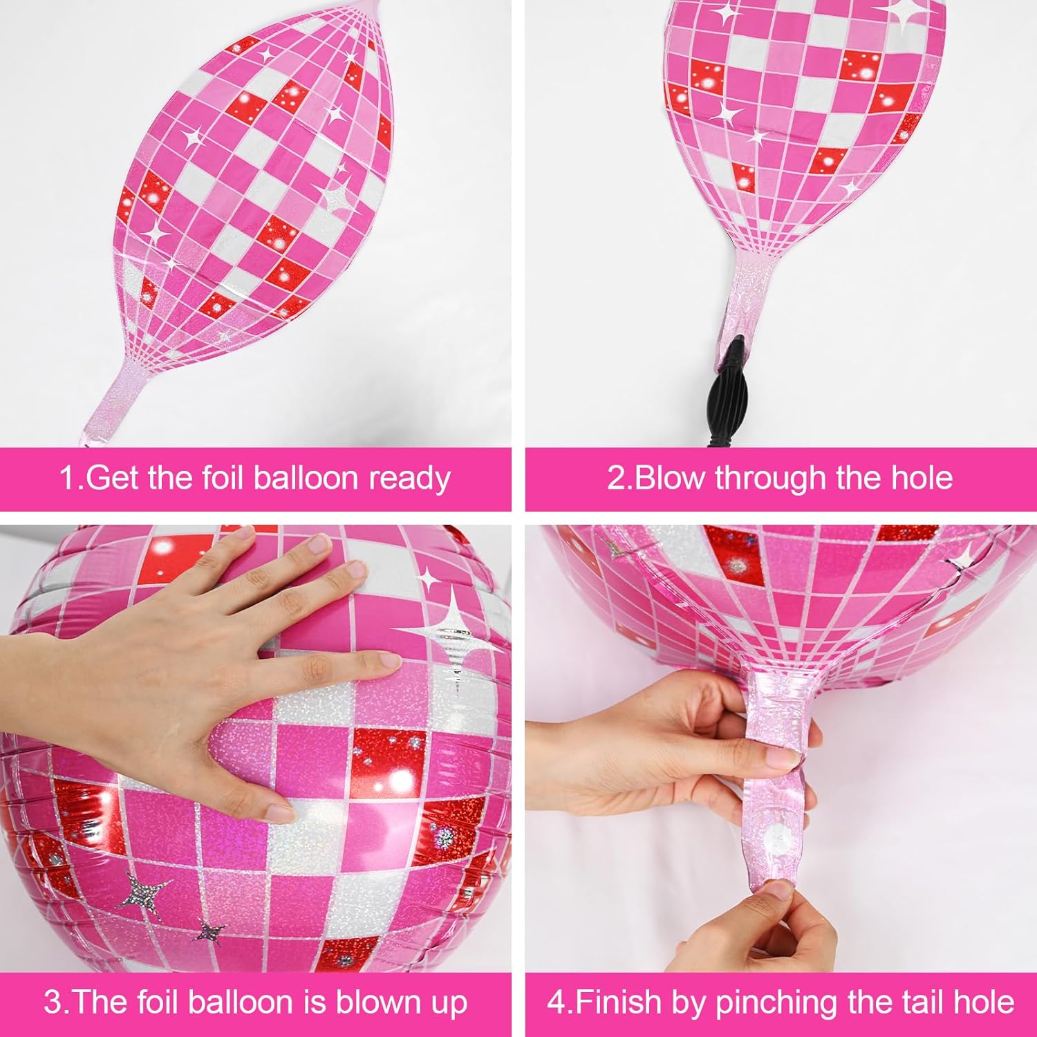 - EASY TO USE:These pink disco ball decorations balloons can be filled with air or helium.pinch the inflation port of the disco balloon to seal it.the set comes with a straw and ribbon,after the party is over,use the straw to deflate by inserting it into the inflation port,balloons can be reused