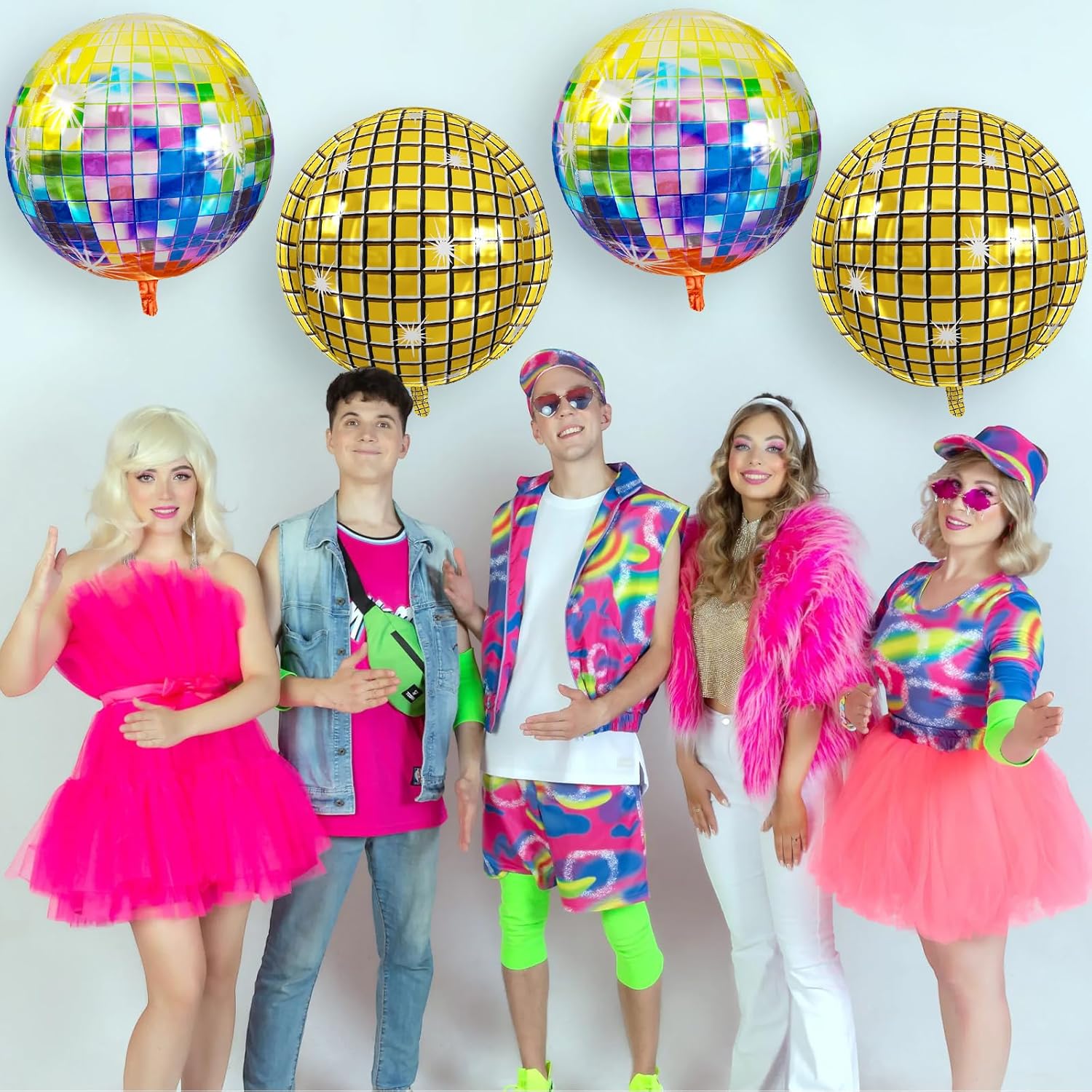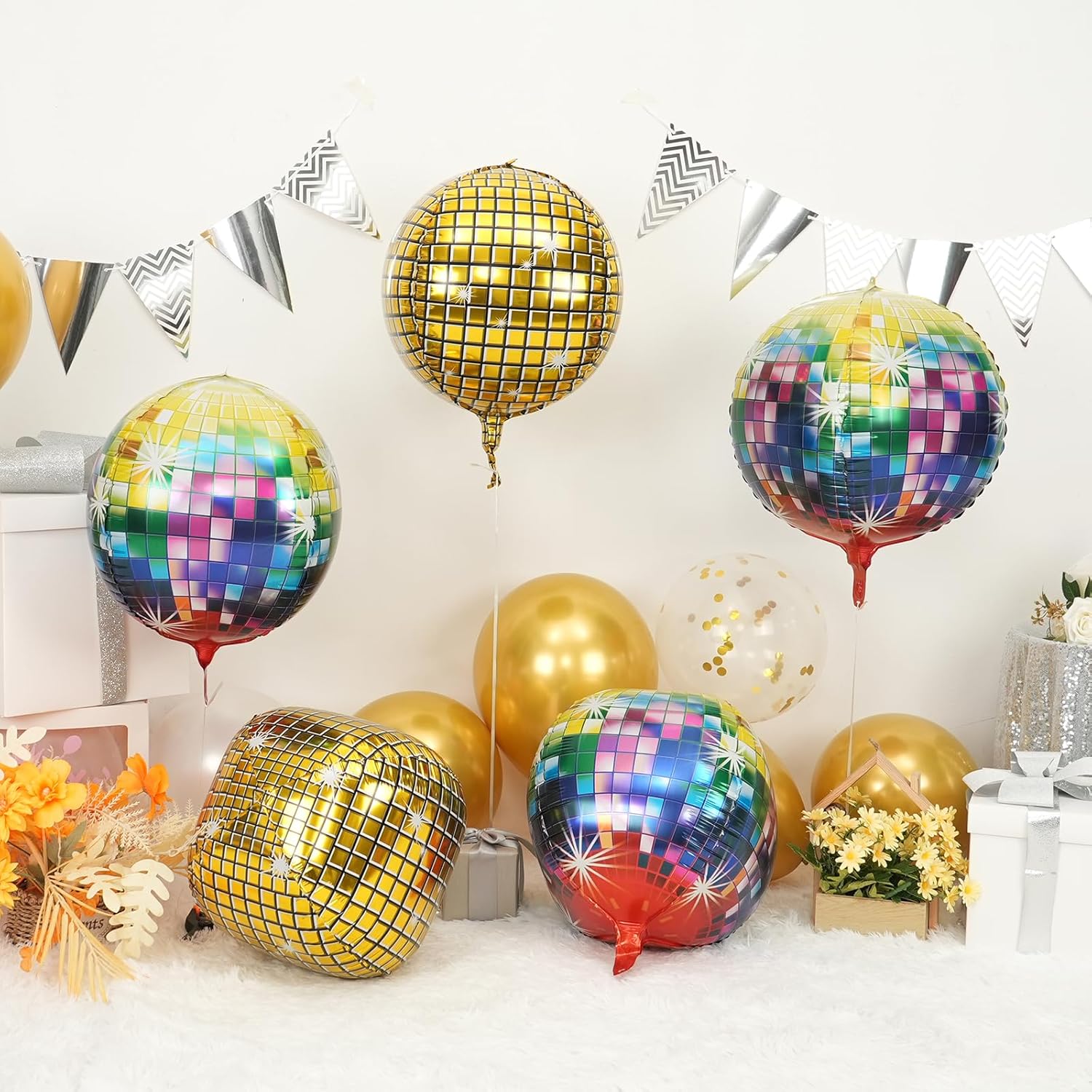 Disco Ball Balloons 4PC,Foil Disco Balloons 22 Inch 4D Round Multicolor Balloon for 70s 80s 90s Birthday Bachelorette Decorations