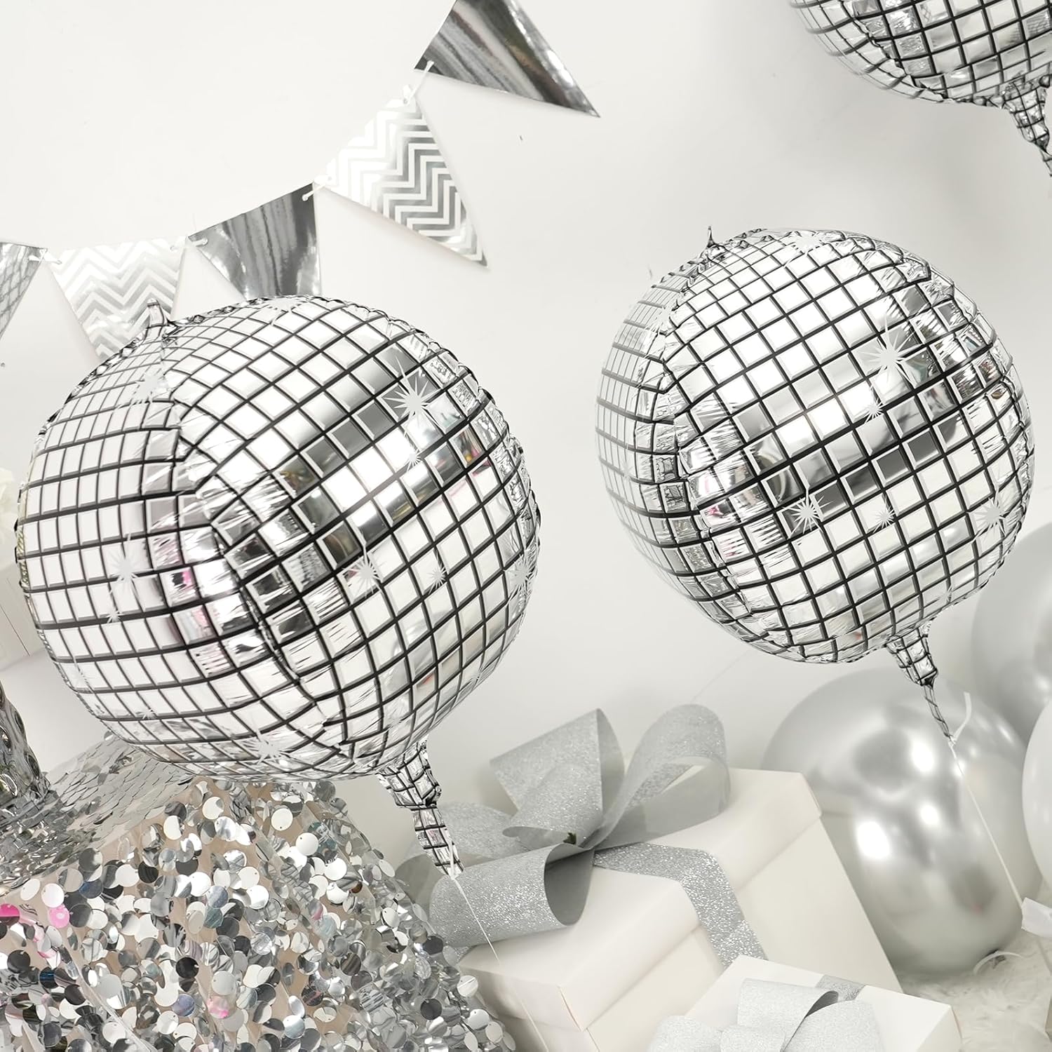 Disco Ball Balloons 4PC,Foil Disco Balloons 22 Inch 4D Round Metallic Silver Balloon for 70s 80s Birthday Bachelorette Graduation Decorations