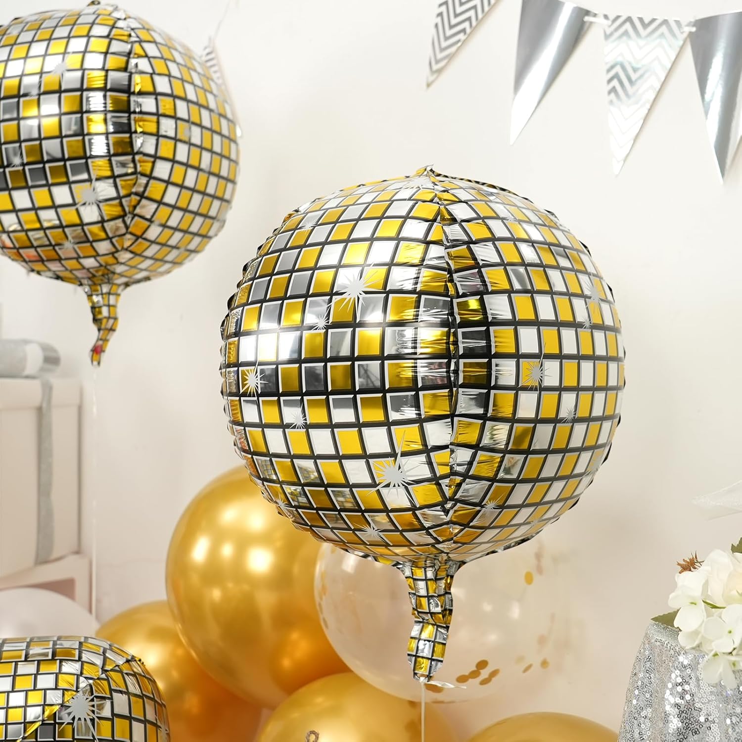 Disco Ball Balloons 4PC,Foil Disco Balloons 22 Inch 4D Round Metallic Gold Silver Balloon for 70s 80s Birthday Bachelorette Graduation Decorations