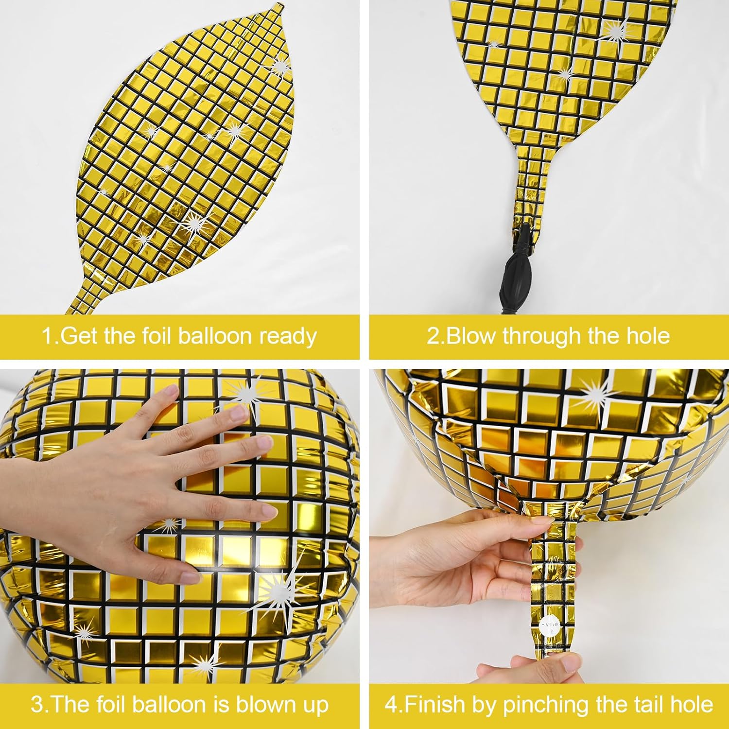 - EASY TO USE:These gold silver disco ball decorations balloons can be filled with air or helium.pinch the inflation port of the disco balloon to seal it.the set comes with a straw and ribbon,after the party is over,use the straw to deflate by inserting it into the inflation port,balloons can be reused