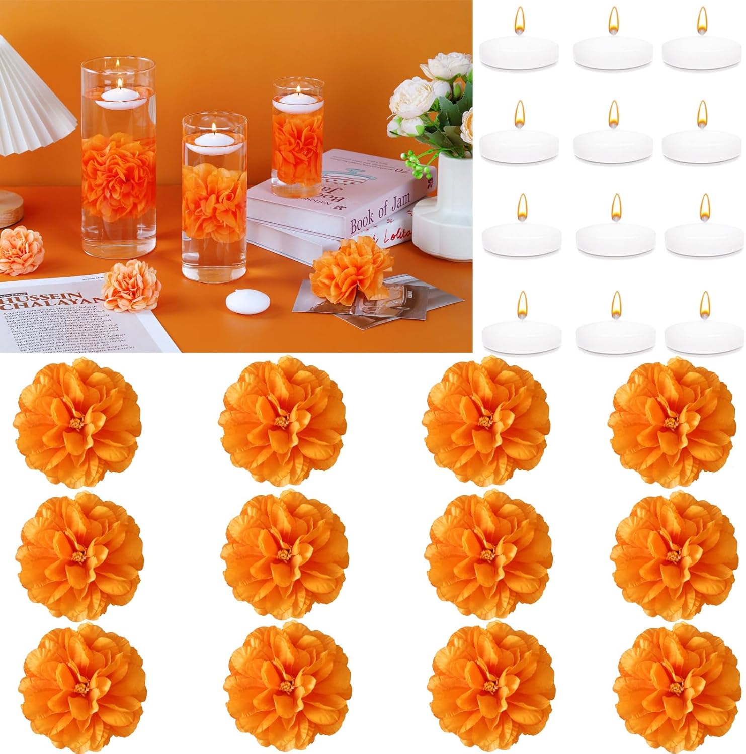 - 24-PCS MATCHED FLOATING SET: This combo include 12 pcs artificial flower and 12 pcs floating candles. Orange flowers’ soft texture and vibrant colors complement the candles’ warm glow, saving you the trouble of matching separate items