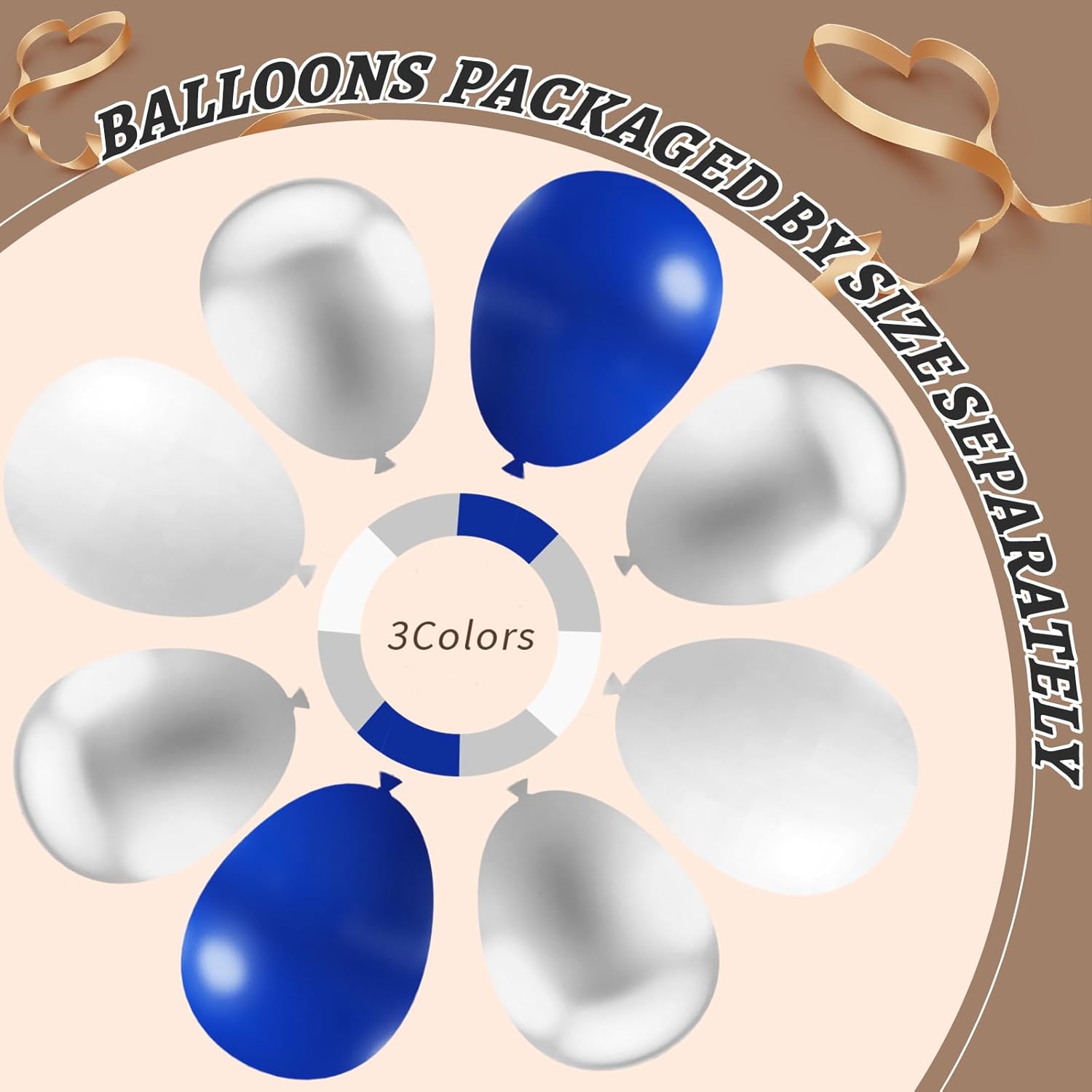 - Package List :blue balloon arch kit includes 18" Royal Blue /metallic silver/White balloons (12 pcs), 12" Royal Blue /metallic silver/White balloons (100 pcs), 10"Royal Blue /metallic silver/White balloons (100 pcs), 5" Royal Blue /metallic silver/White balloons (100pcs),glue dotsx200, ribbonx2, decorative stripx2. plenty in quantity.