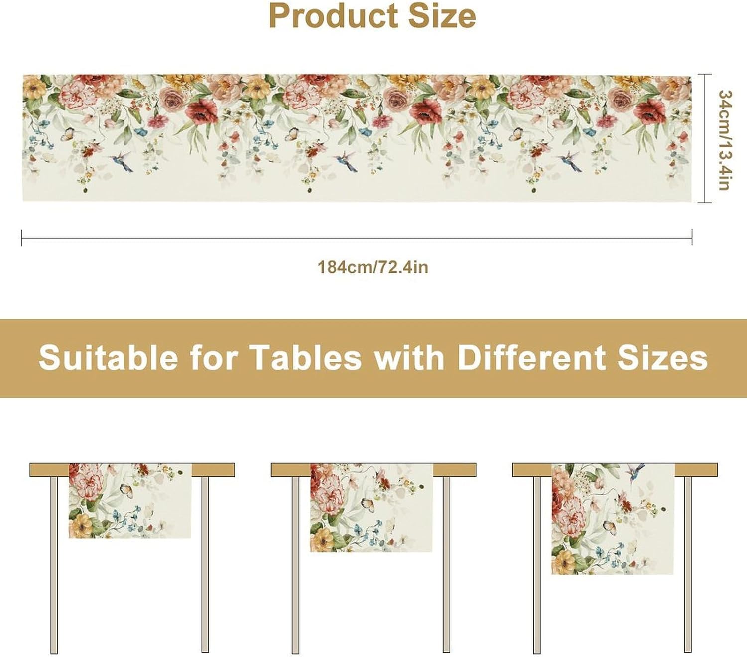 Rustic Floral Table Runner, Watercolor Flower Leaves Hummingbird Butterfly Farmhouse Kitchen Dinning Table Runner for Indoor Outdoor Home Wedding Party Holiday, 13x90 Inch