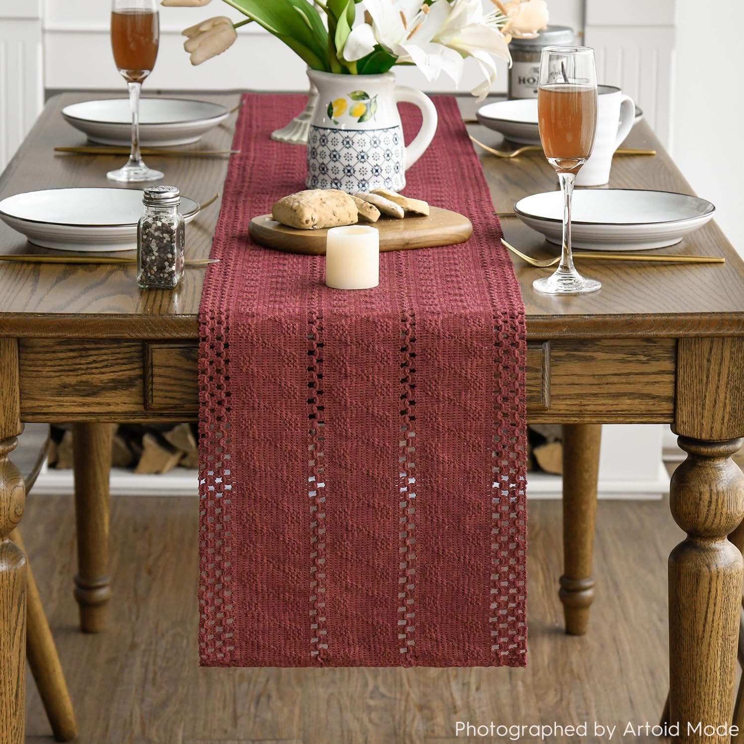 Artoid Mode Red Farmhouse Woven Rustic Hollow Table Runner, Seasonal Holiday Hollow Kitchen Dining Table Decoration for Home Party Decor 12x48 Inch