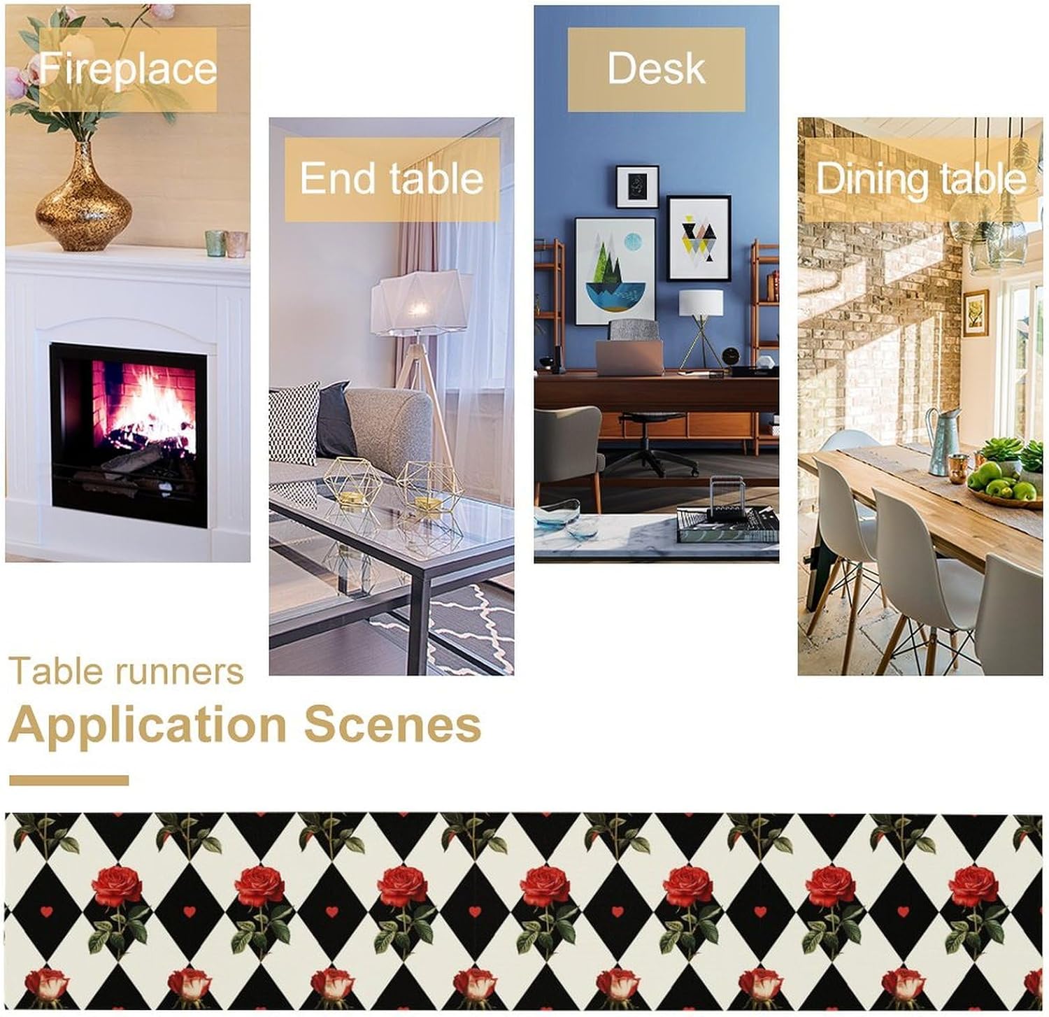 Vintage Rose Table Runner, Red Rose Hearts Black White Checkered Background Table Runner for Kitchen Dinning Table Runner Decor Home Wedding Party Holiday, 13x120 Inch