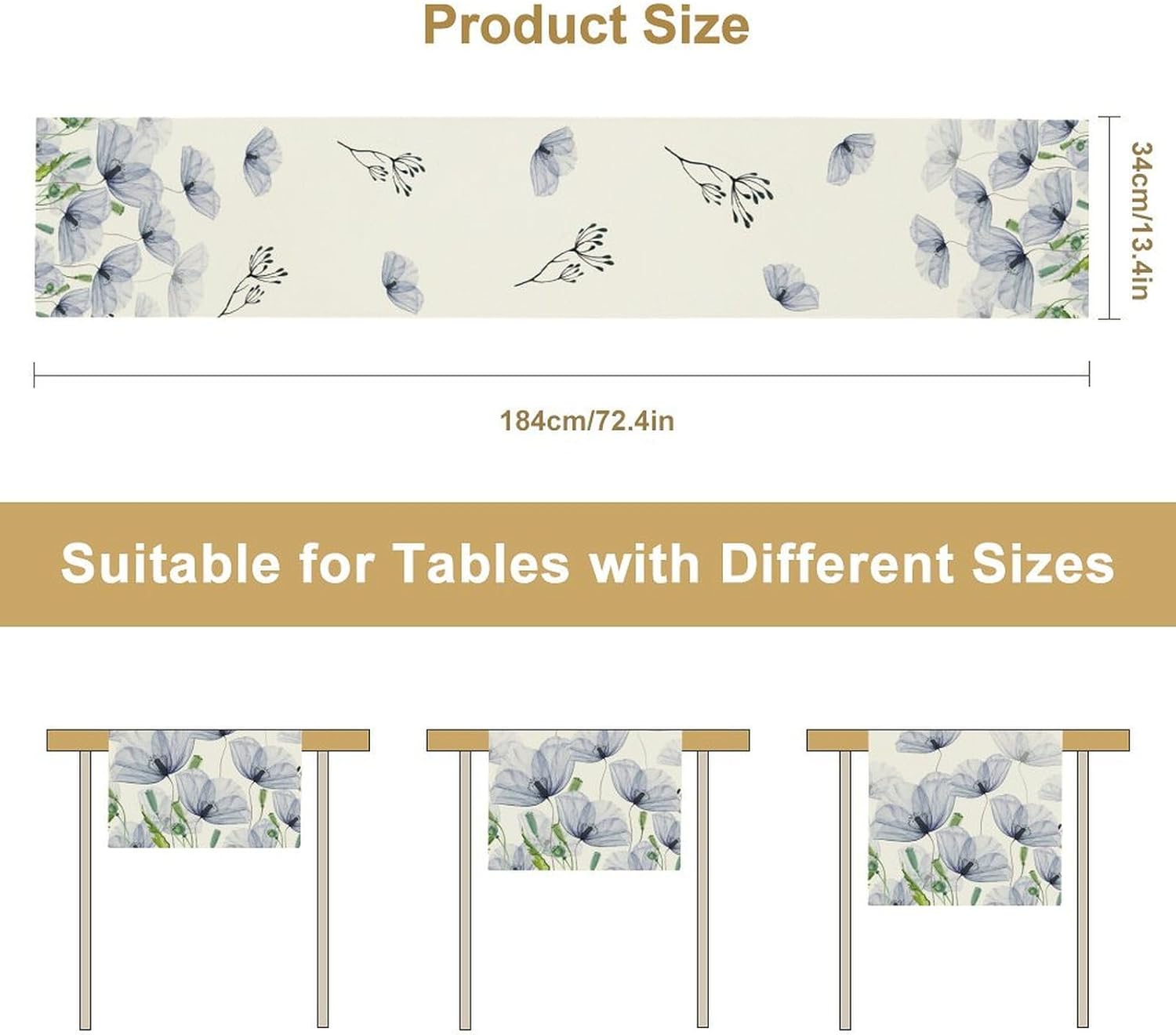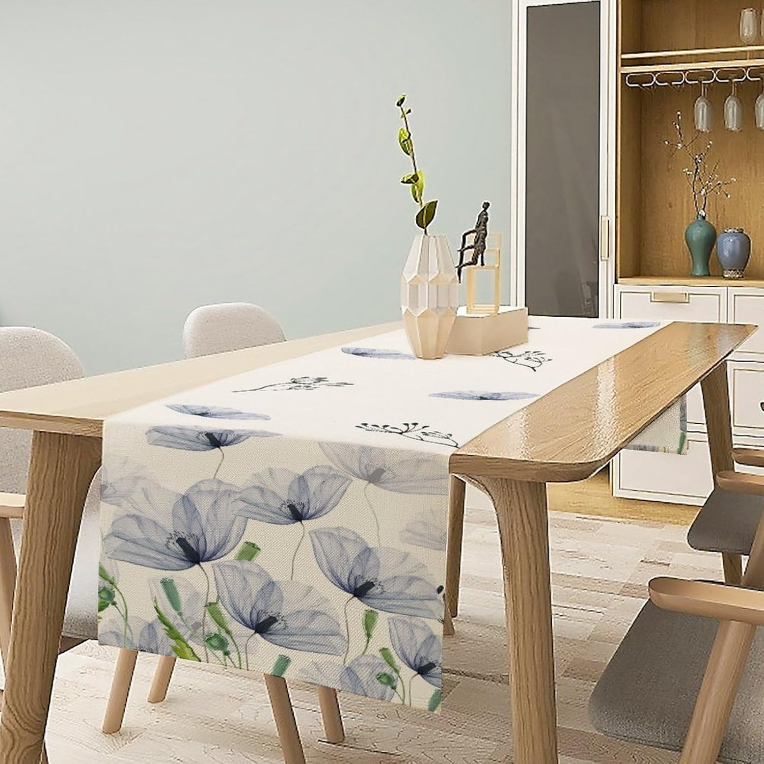 Watercolor Poppy Floral Table Runner, Abstract Seasonal Spring Summer Blue Purple Flower Kitchen Dinning Table Runner for Indoor Outdoor Home Wedding Party Holiday, 13x120 Inch