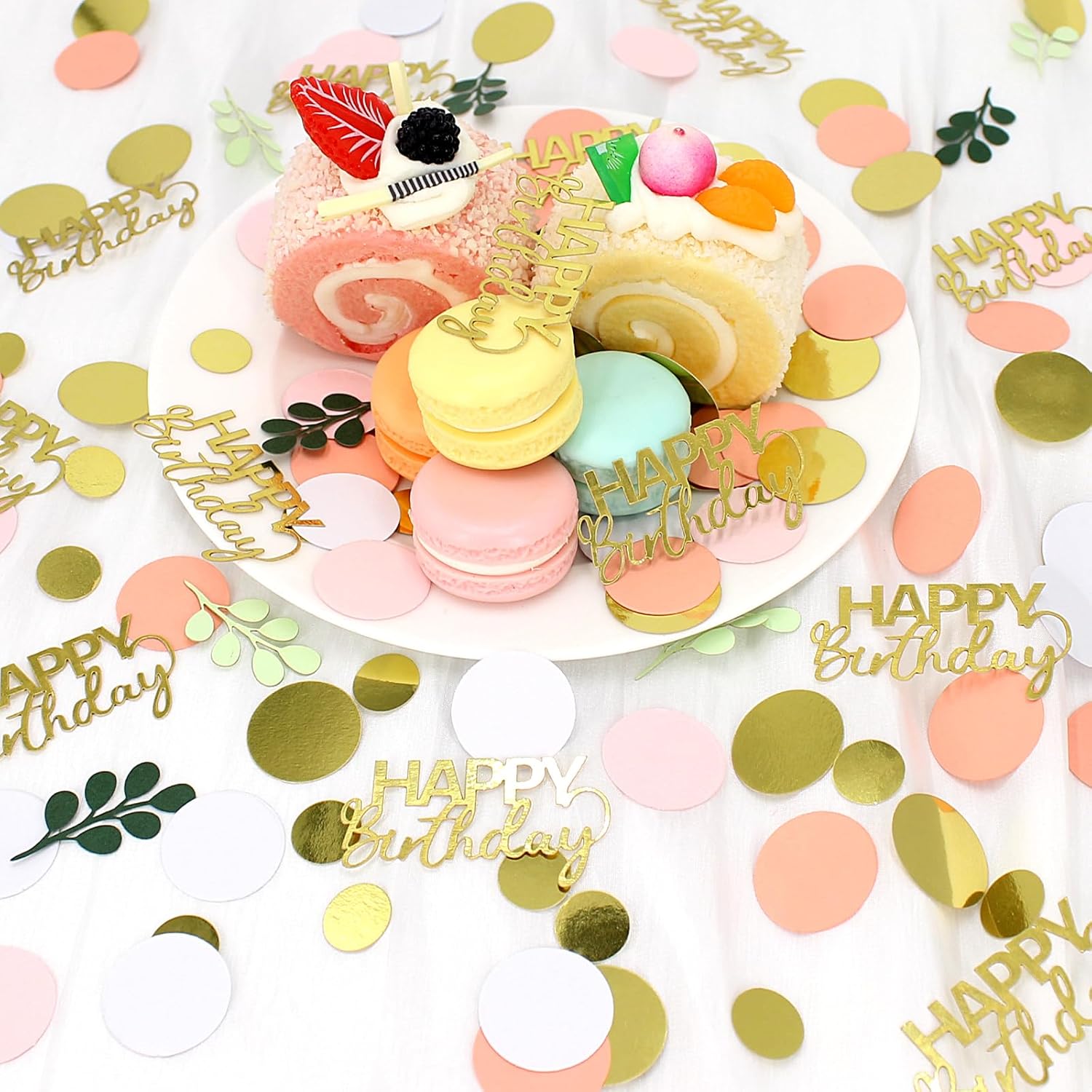 - 3.Charming Colors.The birthday table confetti combined 6 colors(shiny gold foil paper/blush pink/peach pink/white/light green/dark green) ,the vibrant colors make the birthday table decor warm and full of vigor.