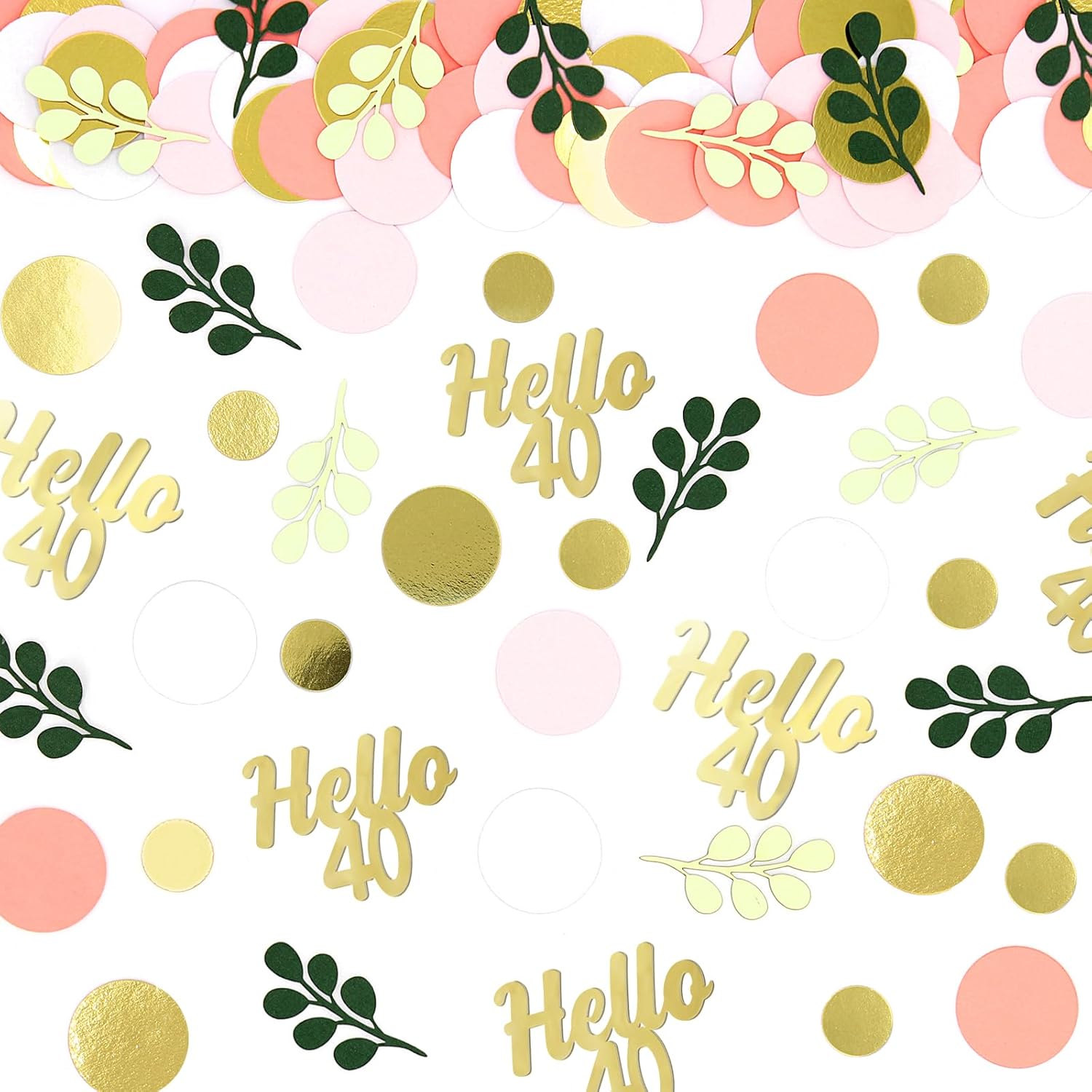 - 3.Charming Colors.The hello forty birthday table confetti combined 6 colors(shiny gold foil paper/blush pink/peach pink/white/light green/dark green) ,the vibrant colors make the birthday table decor warm and full of vigor.