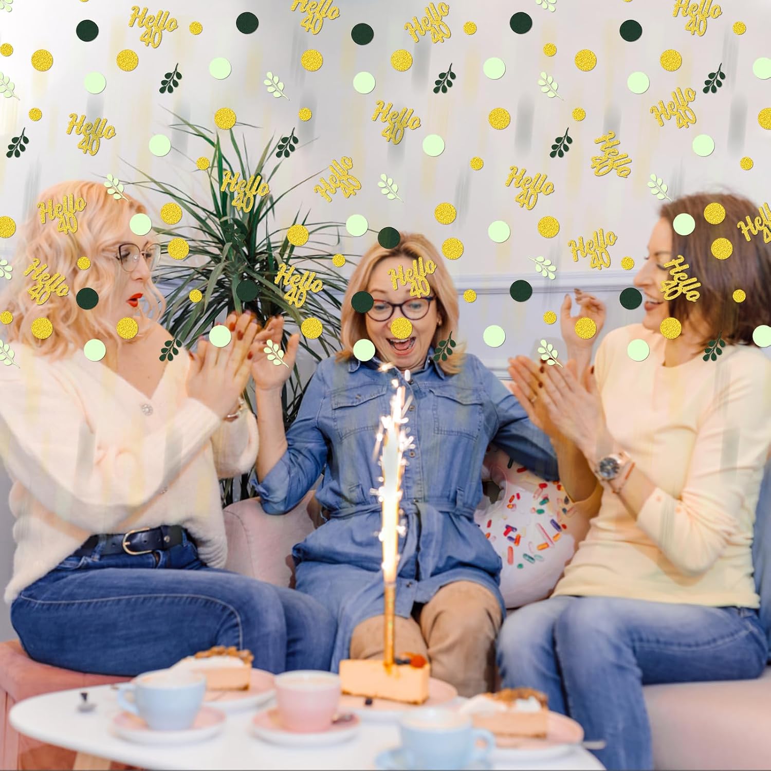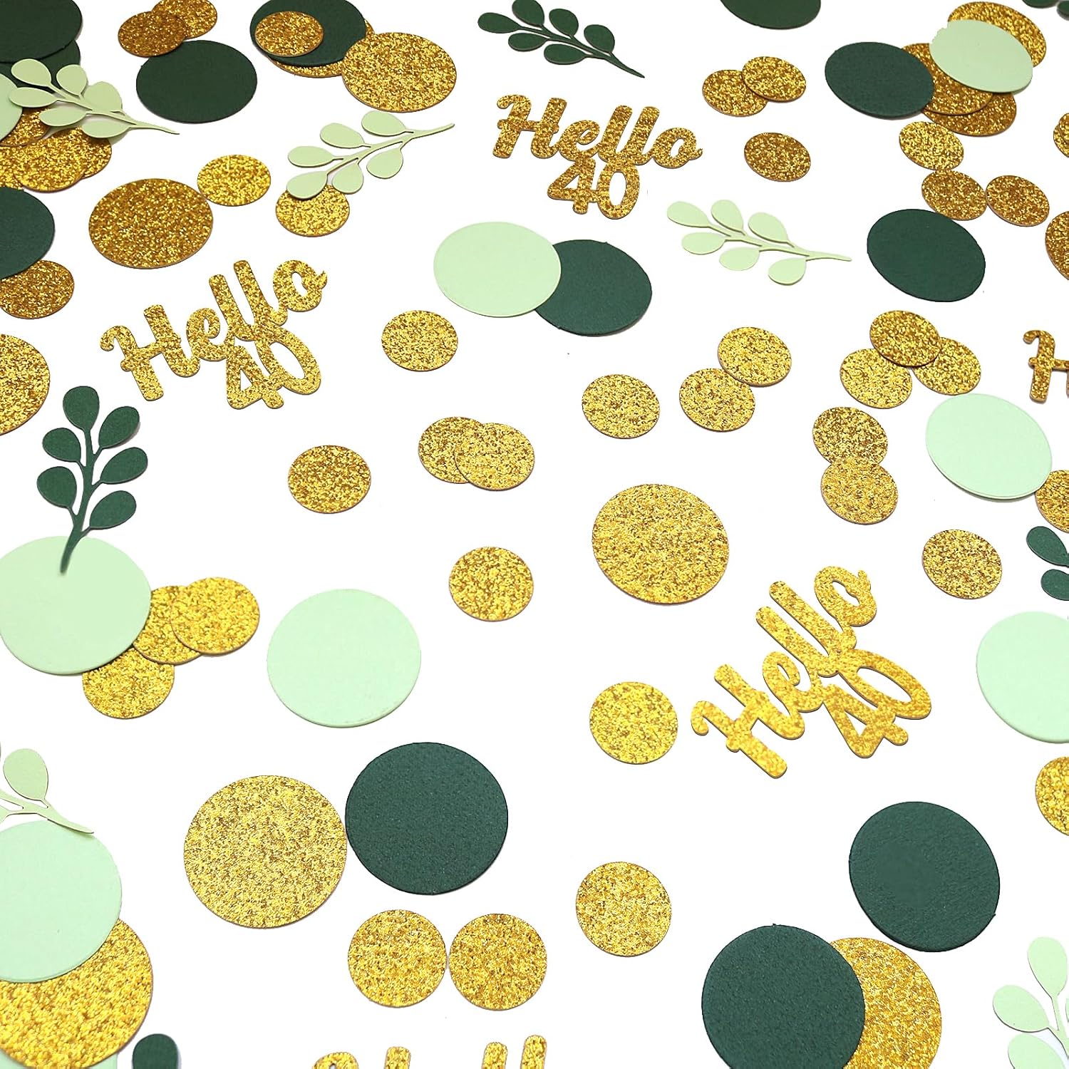 - 1.Great Addition to 40 Birthday Party.The green and gold circle dots with hello 40 confetti scatter are shiny and fresh,very sparkle,a perfect addition to 40th birthday theme,nice sage green 40th birthday decorations for women/men.