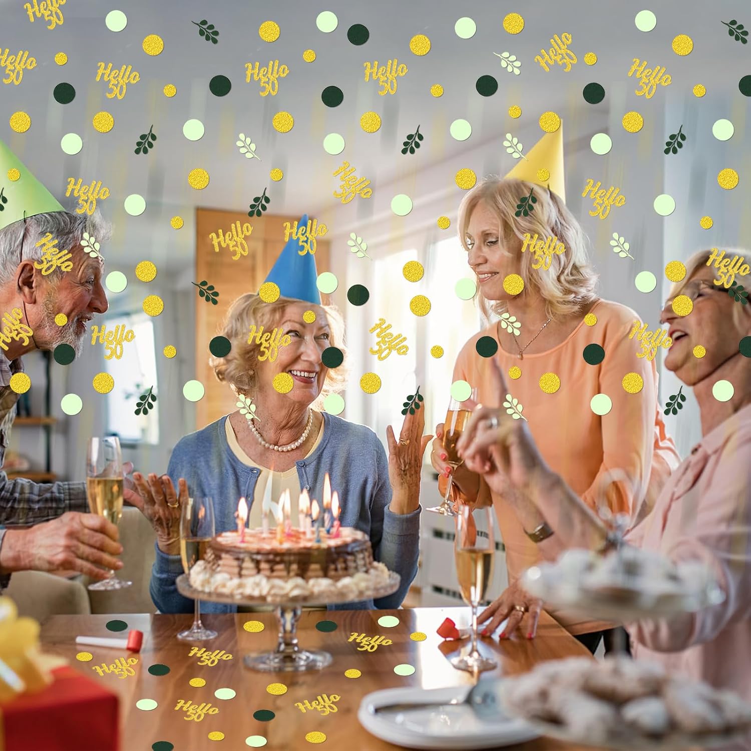 - 1.Great Addition to 50 Birthday Party.The green and gold circle dots with hello 50 confetti scatter are shiny and fresh,very sparkle,a perfect addition to 50th birthday theme,nice sage green 50th birthday decorations for women/men.