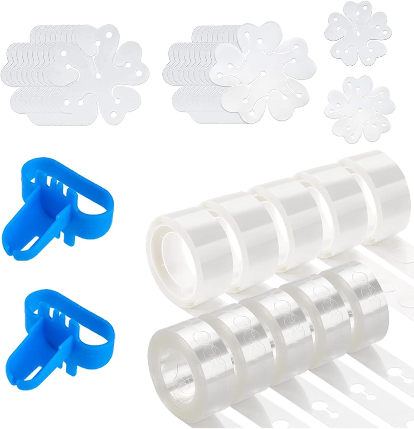 - 【Super Value Pack】: Package contains 16.4ft/5m*5 rolls of balloon tape, 100pcs*5 rolls of balloon glue dots, 10pcs single balloon flower clips, 10pcs double balloon flower clips and 2pcs balloon tying tools.