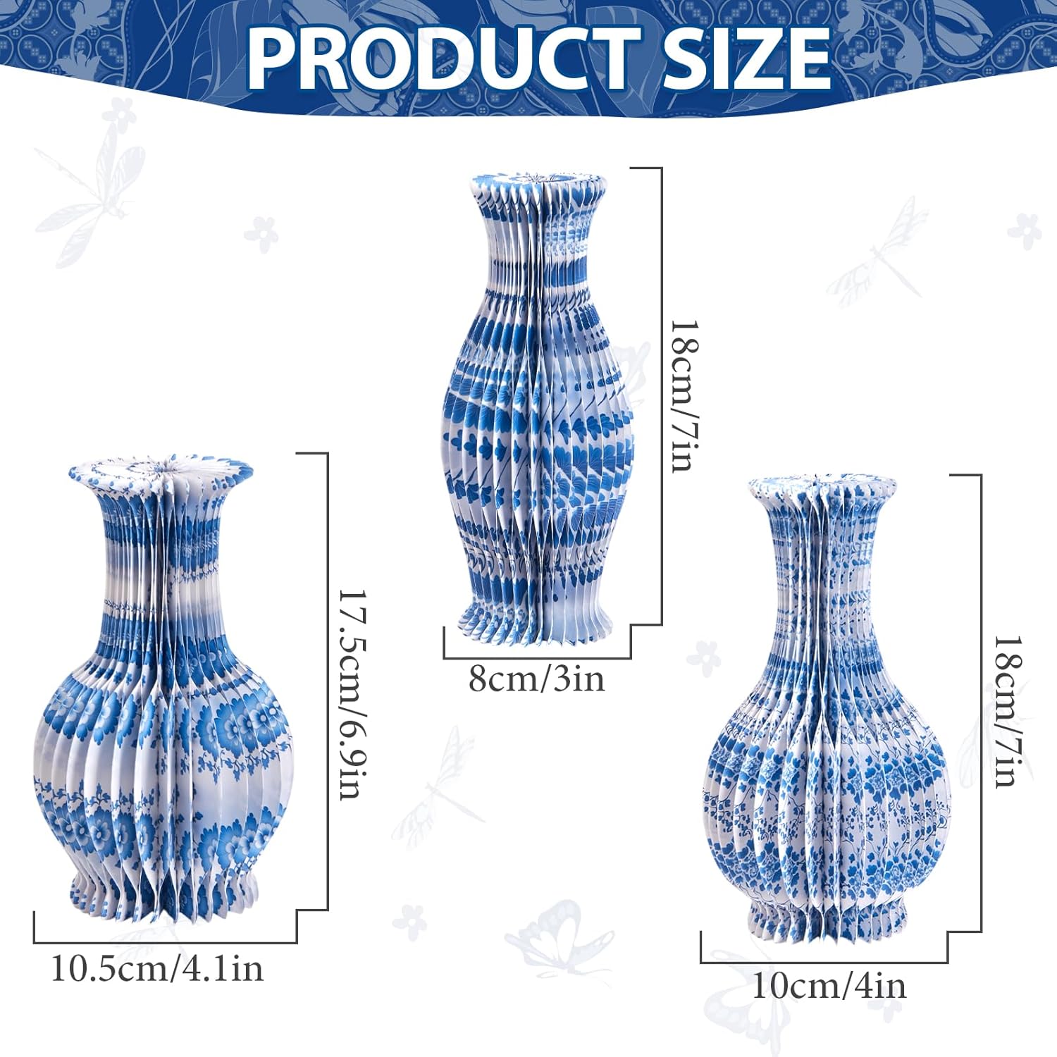 3 Pcs Blue and White Paper Honeycomb Vase, Foldable Decorative Vase with Magnetic Closure, Chinoiserie Décor Vase, Reusable Table Centerpiece for Wedding, Baby Shower, Home Decor