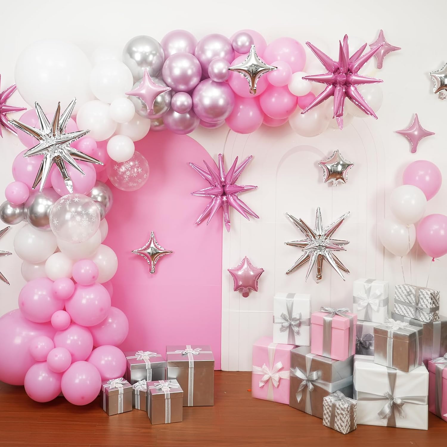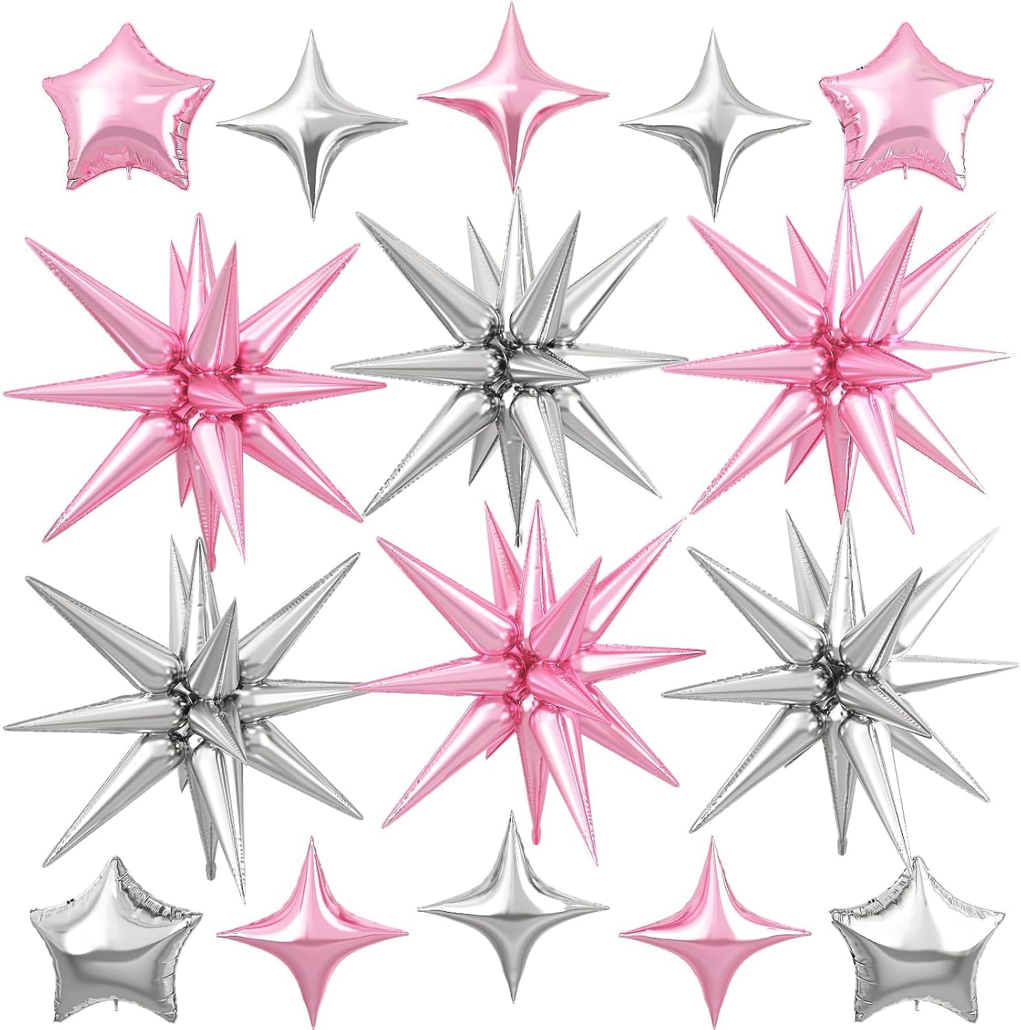 - Package: This set includes 6pcs 22inch explosion star foil balloons(light pink*3, silver*3), 4pcs 10inch star foil balloons(light pink*2, silver*2), 6pcs 10inch four angle star balloons(light pink*3, silver*3), and a ribbon. Perfect for creating a dazzling party atmosphere.