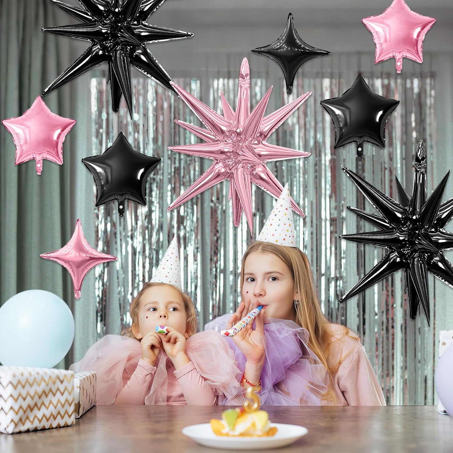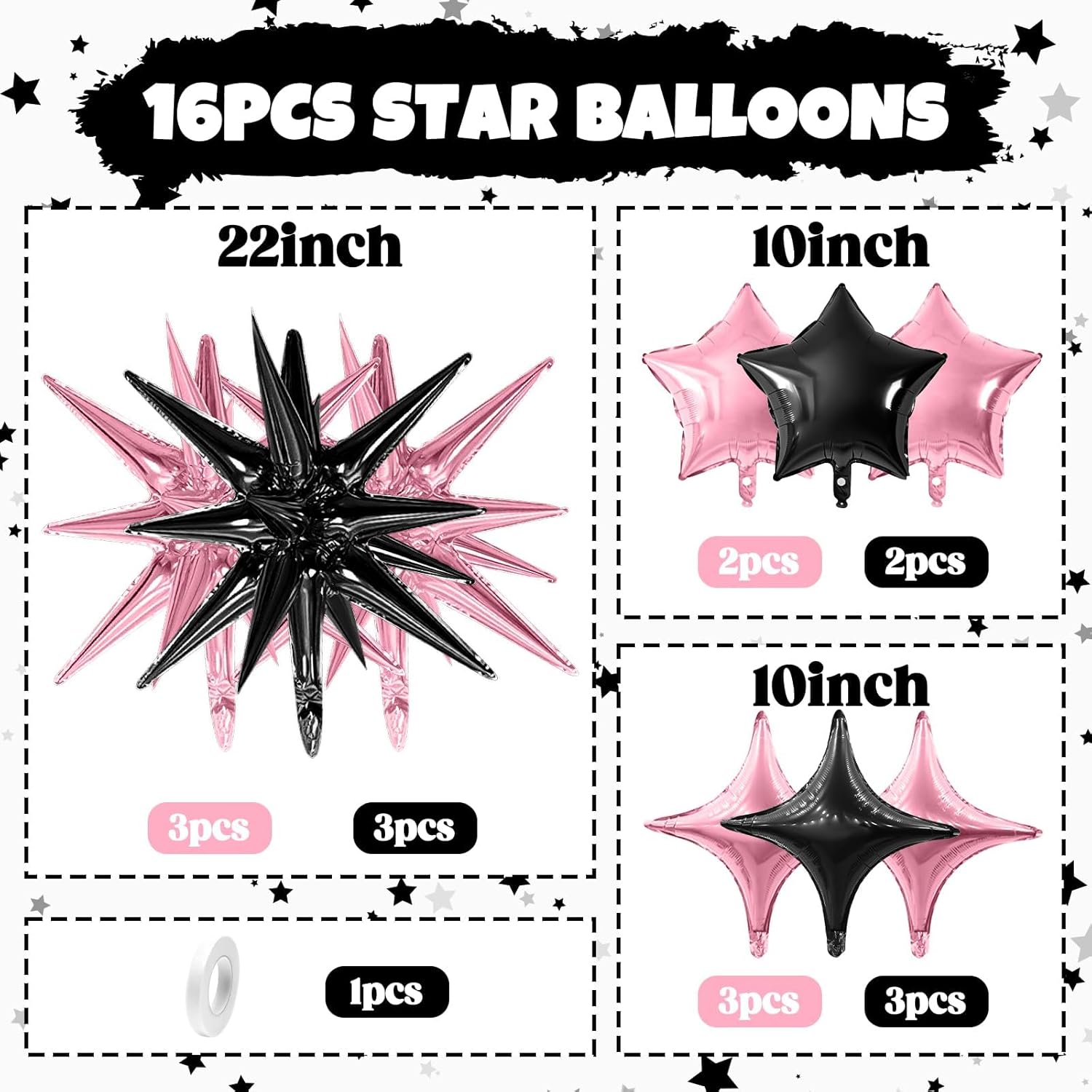 - Package: This set includes 6pcs 22inch explosion star foil balloons(light pink*3, black*3), 4pcs 10inch star foil balloons(light pink*2, black*2), 6pcs 10inch four angle star balloons(light pink*3, black*3), and a ribbon. Perfect for creating a dazzling party atmosphere.