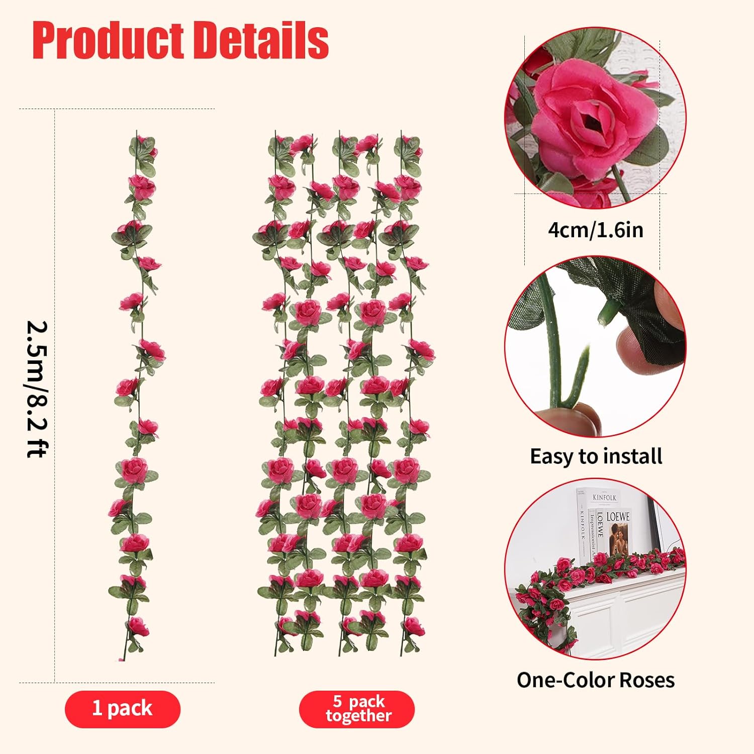 - PACKAGING: Total length 41FT, each vine 8.2FT (250CM), 5 vine plants hanging fake flower garland. Each plant has 45 flowers. Rose heads are 1.6” (4CM) in diameter. 45 leaves. These 5 rose vines are fluffy enough to decorate your room!