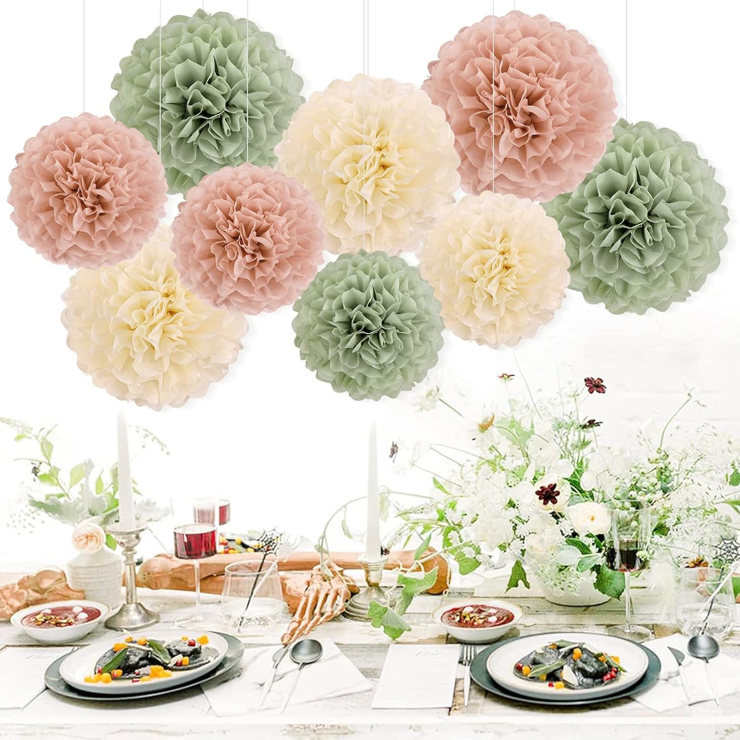- Sage Green Tissue Pom Poms Set - Product Composition:15 premium tissue pom poms in sage green, dusty pink and beige - complete bohemian decor package for instant themed party transformations.