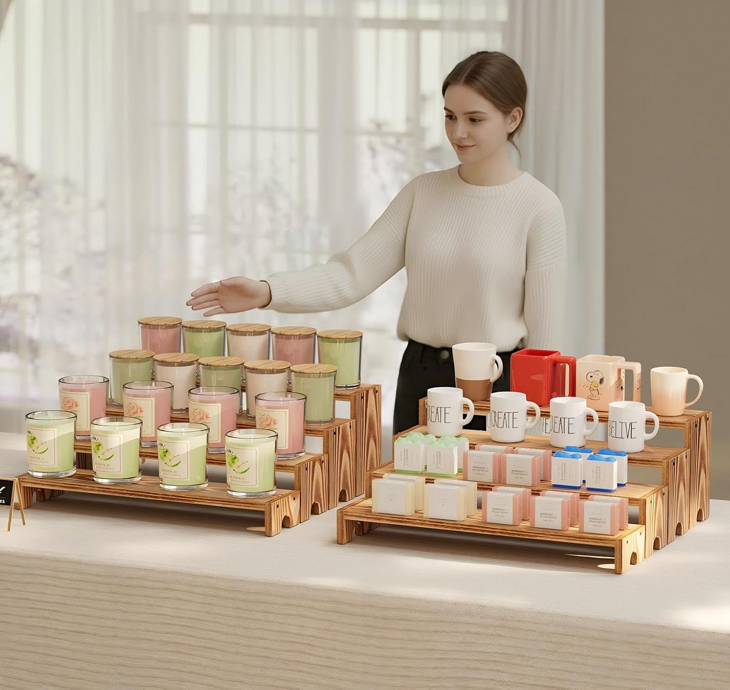 - 【All-Scenario Wooden Tiered Display Riser】Turn every nook into a styled gallery! Curate vanity perfumes, spotlight collectible figures in living rooms, stage succulent gardens in bedrooms, or organize spices/coffee gear in kitchens. Shift instantly from Tiered Spice Rack Organizer to party wooden cupcake stand, craft show display stands, or display shelf for vendors. Nestable 4-tier design adapts apartments to expo halls – becomes portable vendor booth display items for weddings/markets