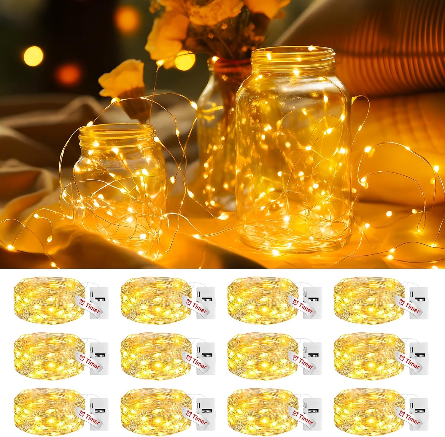 Litogo 12 Pack Fairy Lights Battery Operated with Timer, 20 LED 3 Modes Twinkle Light, 7ft Waterproof Silver Wire Mini Small Bulk Mason Jar String Light, Decor for Wedding Centerpieces Party Christmas