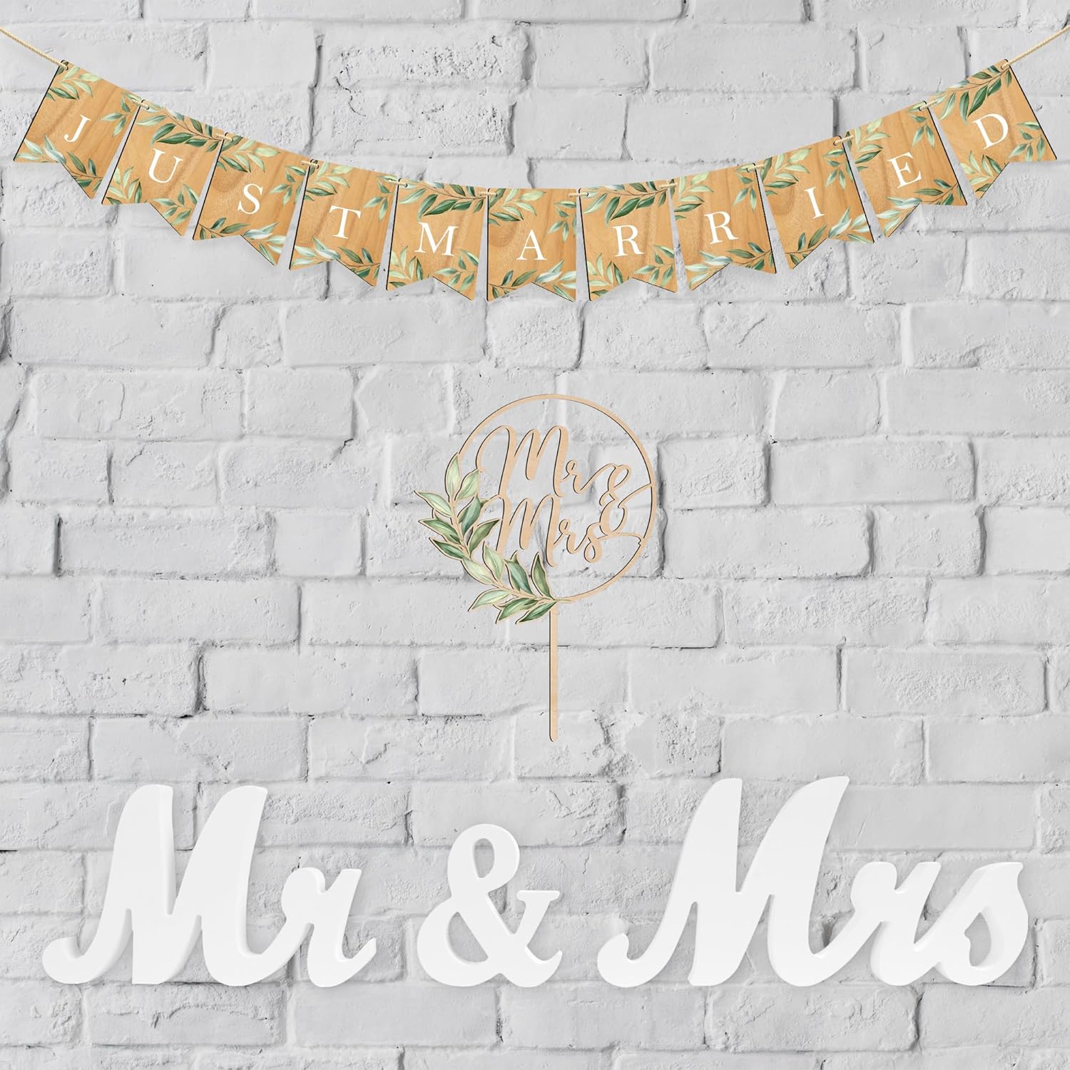 Mr & Mrs Cake Topper & Just Married Banner & Mr Mrs Table Sign Green Wedding Decorations in Wood
