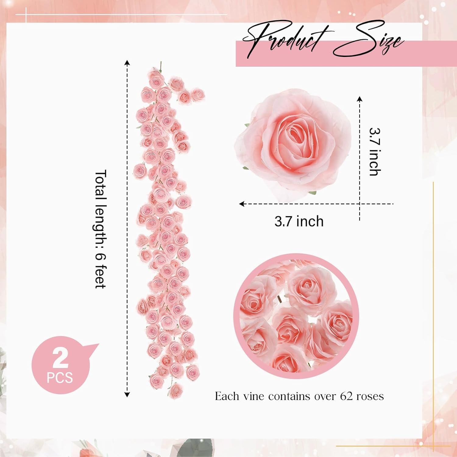 - Package Includes: you will receive 2 artificial pink rose vines; Each rose garland is 6 feet long and diameter of each flower measures about 3.7 inches; Each rose wreath contains 62 pink roses; If you feel that the length is not enough, you can connect multiple vines together for use