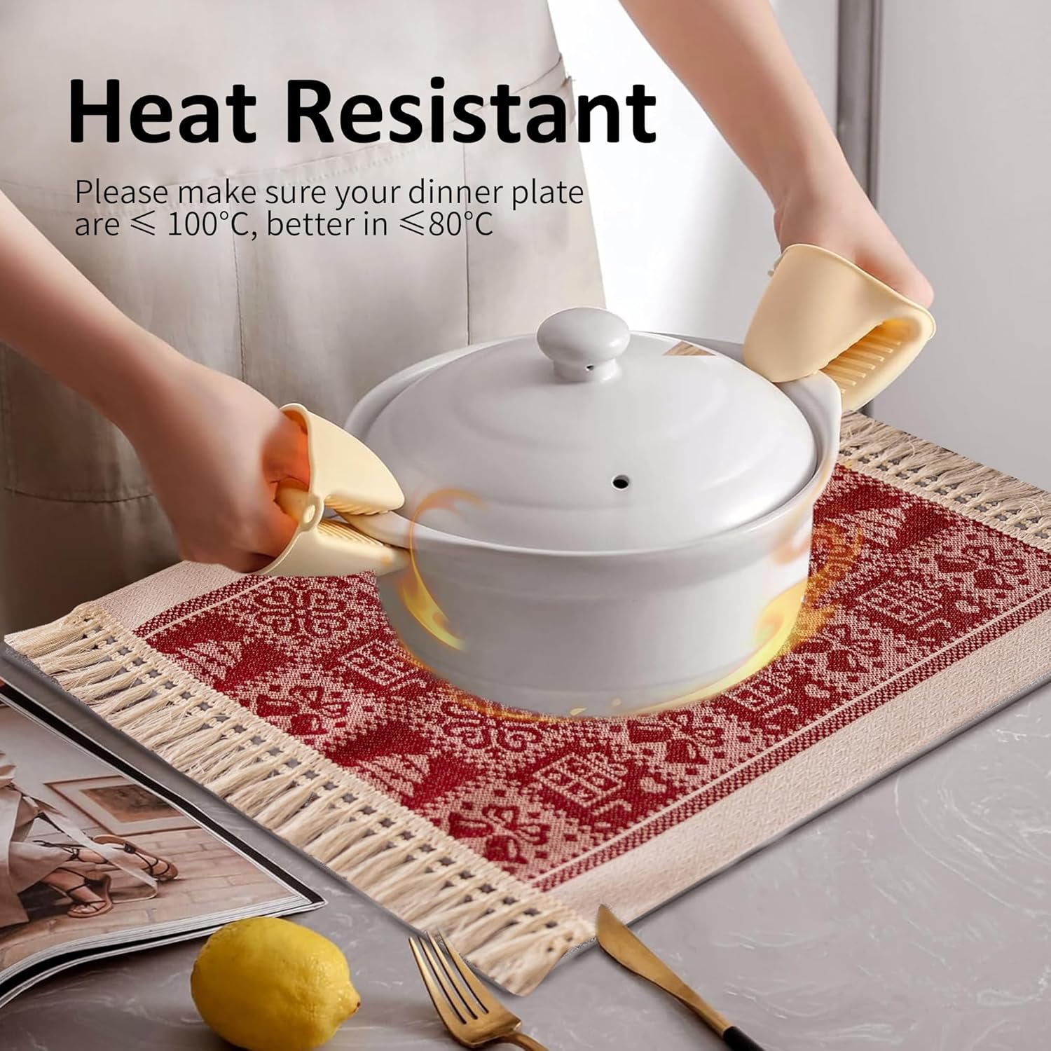 - Washing instructions: Farmhouse placemats hand wash with cold water, lay flat in a cool place to dry.Kitchen placemats avoid bleaching and ironing to maintain the color and tassel shape