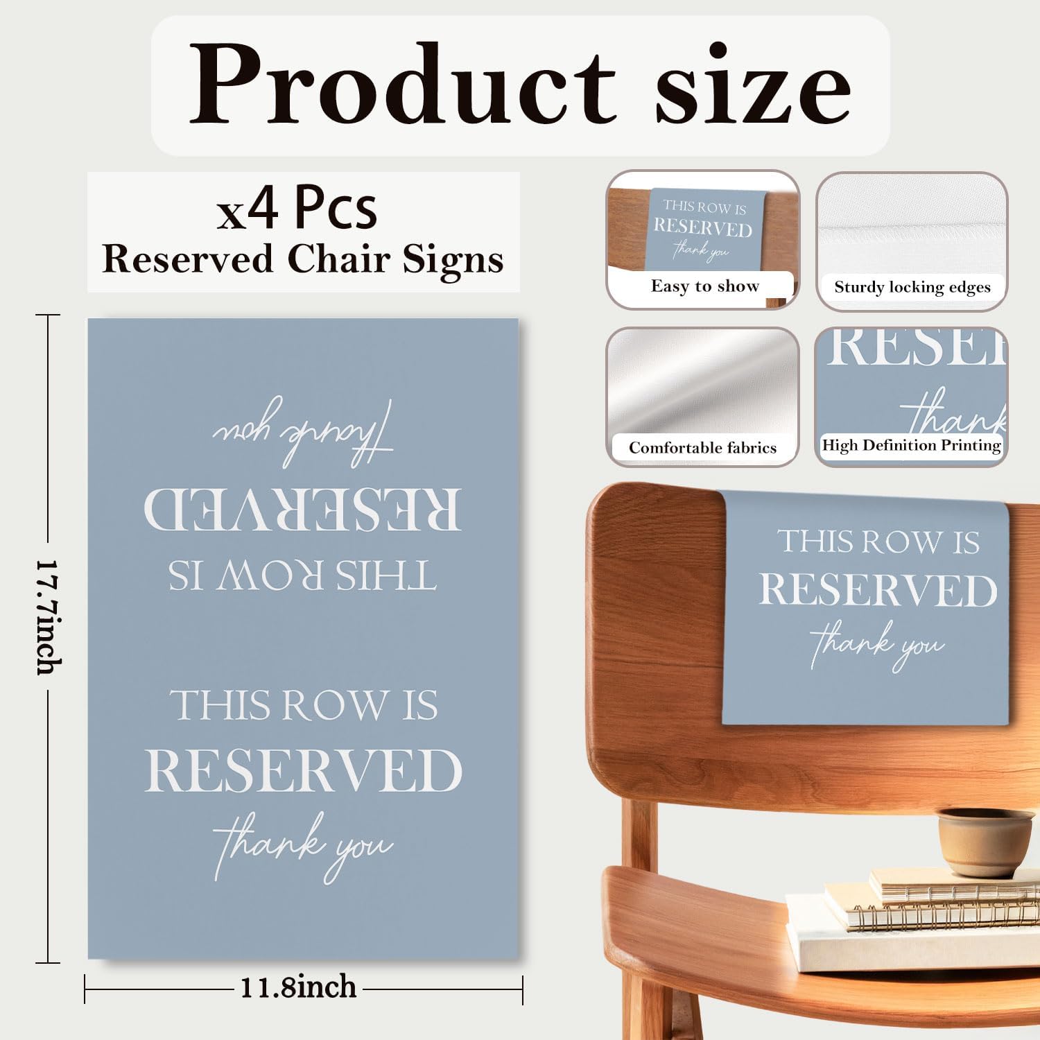 - Universal Size: Each reserved seat sign measures approx. 30 x 45 cm / 11.81 x 17.72 inches, suitable for most standard chairs, pews, or benches. The large, clear lettering ensures your message is easily seen by guests from a distance.