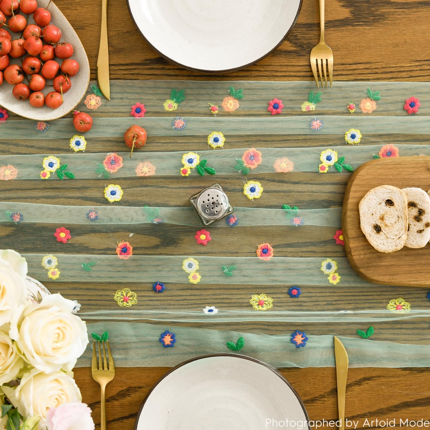 Artoid Mode 3PCS Sage Green Embroidery Daisy Gauze Table Runner 120 Inch 10FT, Seasonal Sheer Dining Holiday Wedding Birthday Table Decor for Home Party