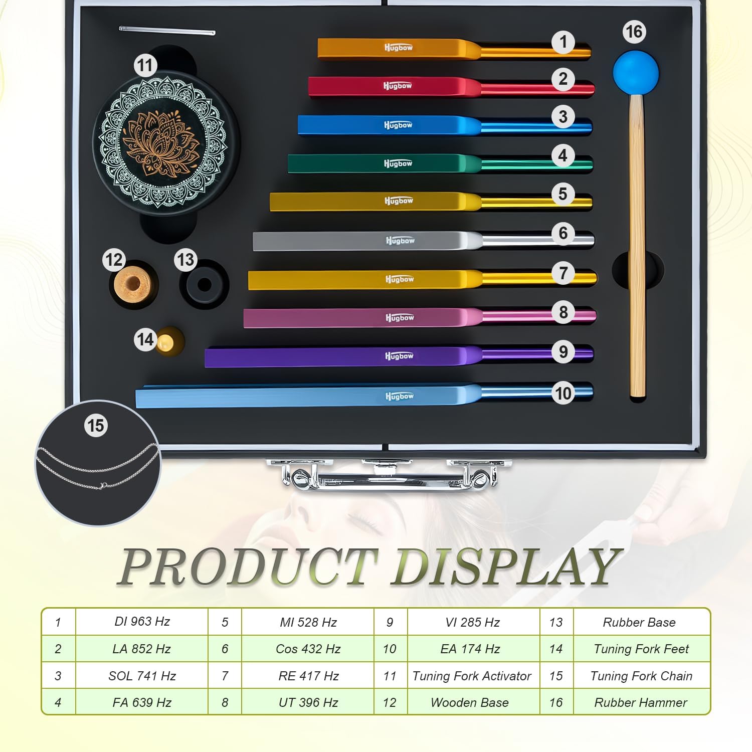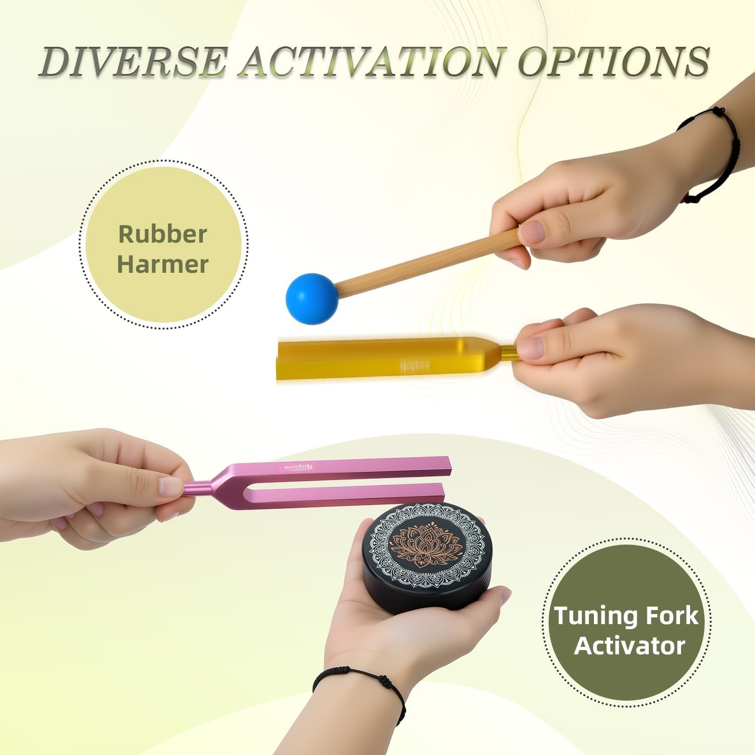 - 【Easy to Use with Accessories】Comes with a tuning fork chain (Cause the tuning fork to vibrate, creating a sound that surrounds the area), a reflex hammer , and a tuning fork activator for versatile striking options. The tuning fork feet disperses vibrations gently into the body, promoting relaxation and slight vasodilation for enhanced well-being.The 10 tuning forks for healing ideal for beginners and professional sound healers.