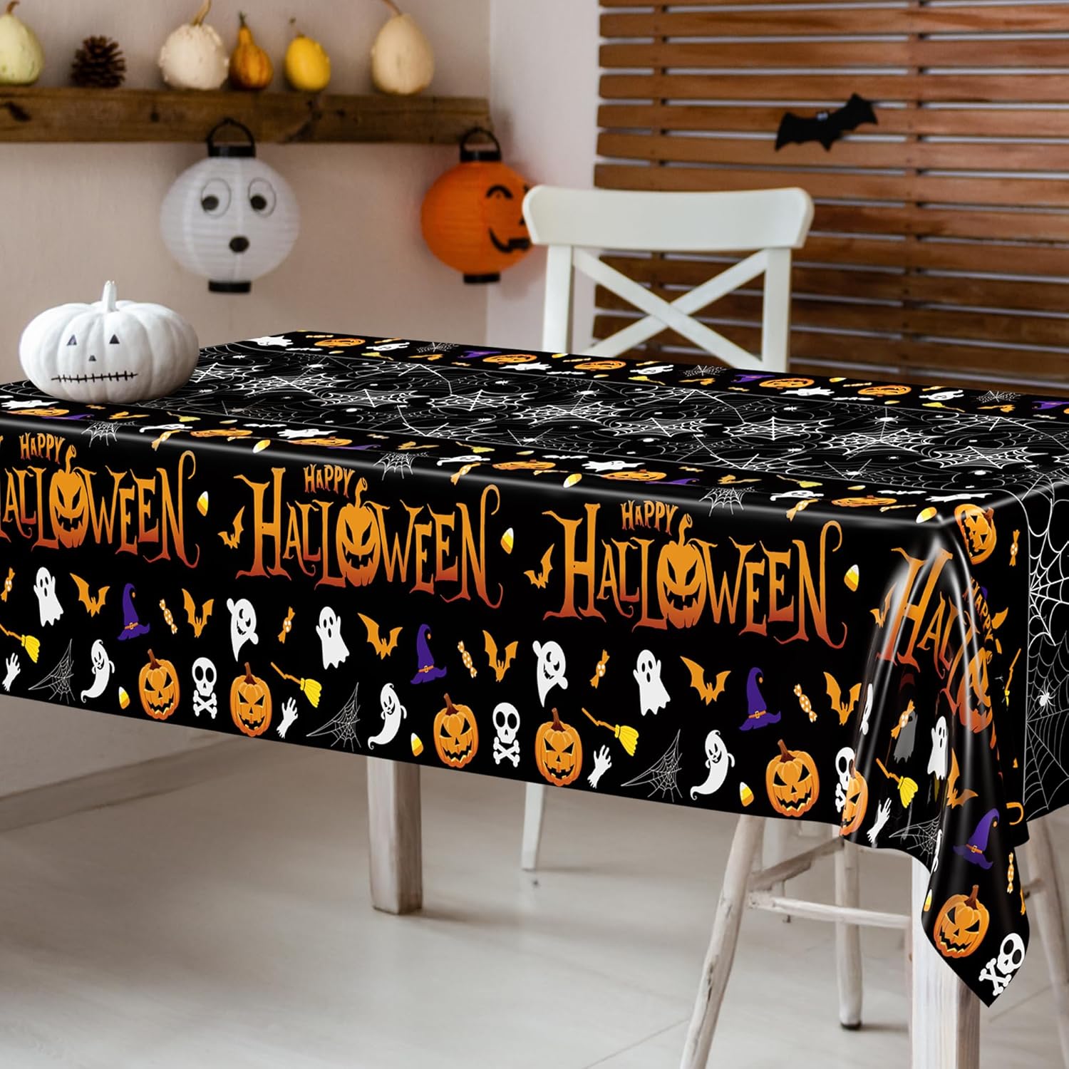 - Halloween Design: These rectangular Halloween plastic tablecloths have a black base color with Halloween elements such as "Halloween", pumpkins, spider webs, ghosts, bats, witch hats and more.