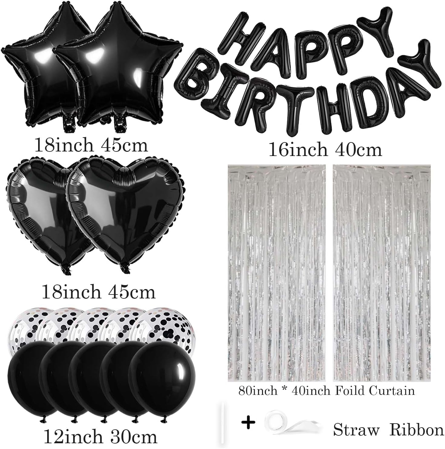 - Happy Birthday Balloon Kit: 13pcs 18inch aluminum foil happy birthday letters, 2 pack silver foil fringe curtains, 2pcs 18inch pentagram star balloons, 2pcs 18inch heart balloons, 5pcs 12inch Black confetti balloons, 5pcs 12inch Black balloons