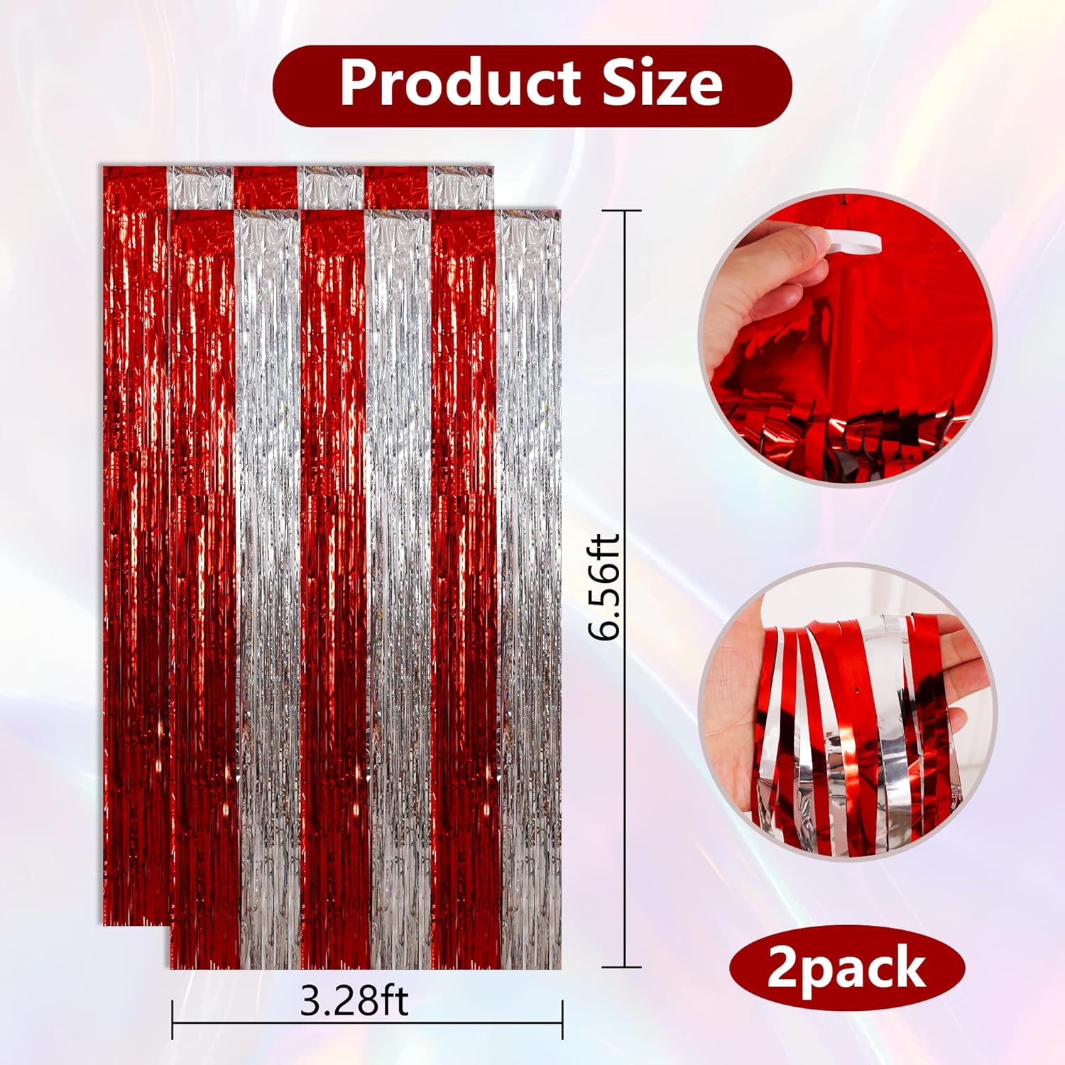 BEISHIDA Red Silver Door Streamers Backdrop Foil Fringe Tinsel Party Streamers Curtains Photo Backdrop - 2Pcs for Birthday Graduation Christmas Party Decoations