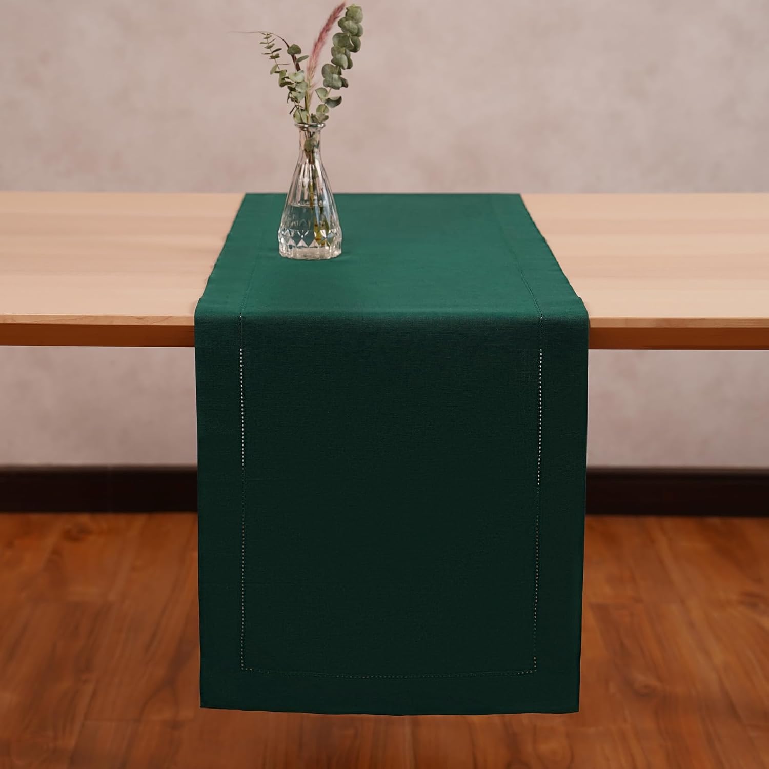Cotton Linen Green Table Runner 14 x 36 Inches – Hemstitch Coffee Table Runner 14 x 36 Inch – Washable Fabric Scarf Ideal for Thanksgiving, Christmas, Winter Decoration – Serena