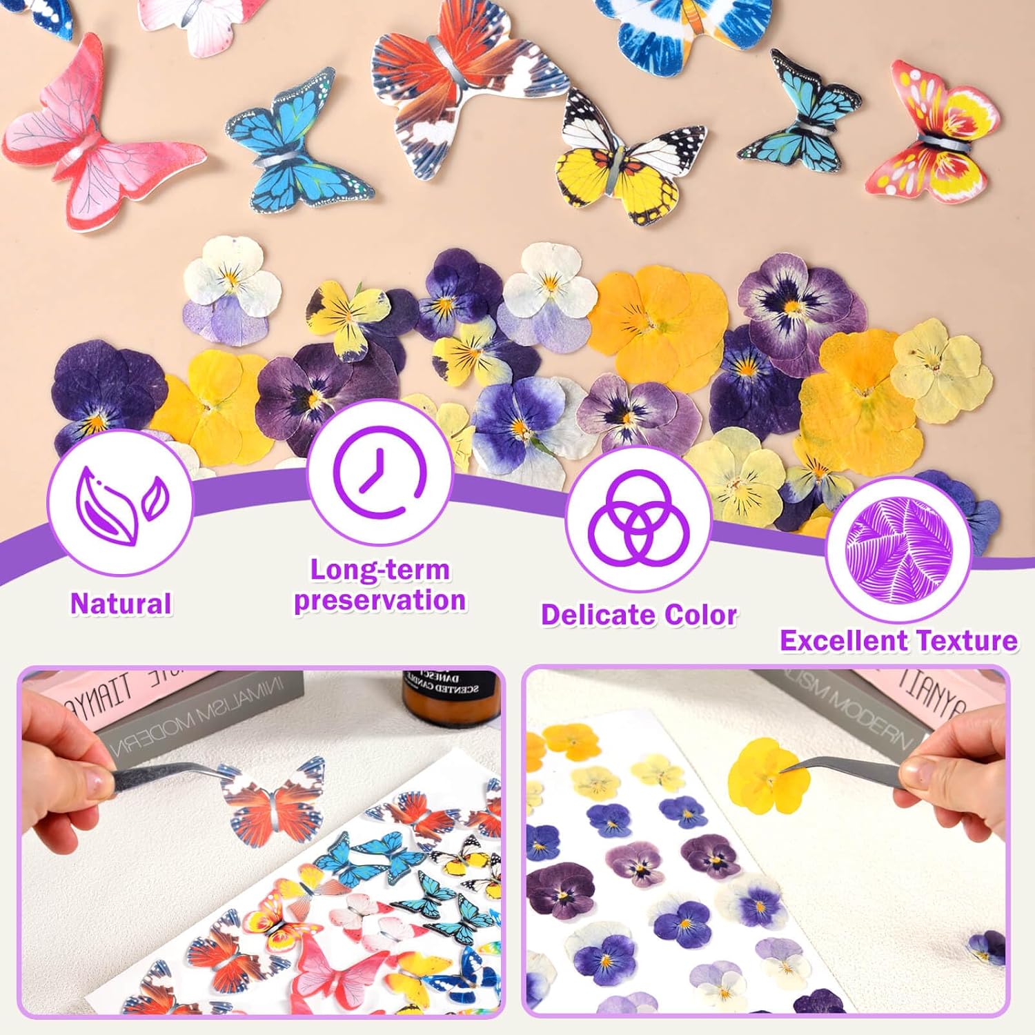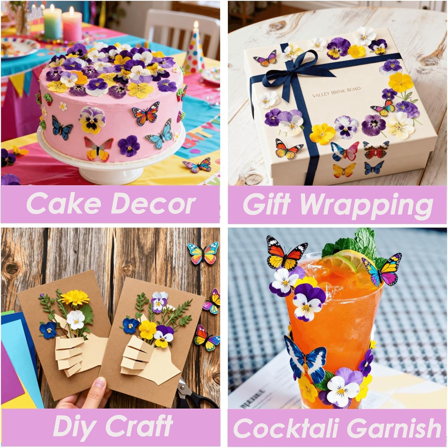 - Floral Butterfly Set : Includes 40 pressed edible pansy flowers and 40 realistic wafer paper butterflies in assorted styles, sizes, and colors—perfect for cake decorating, cocktails, and DIY crafts.