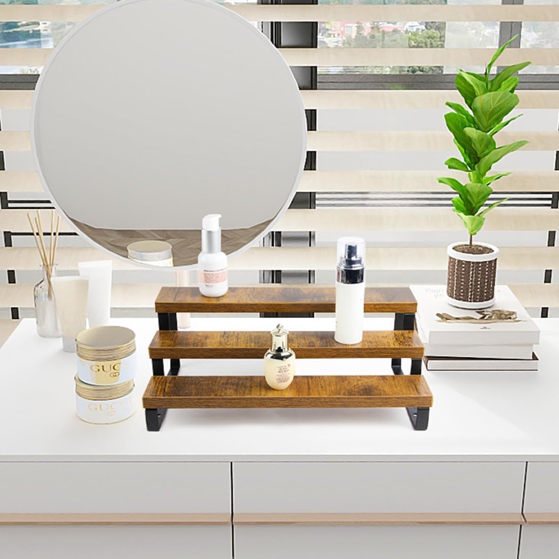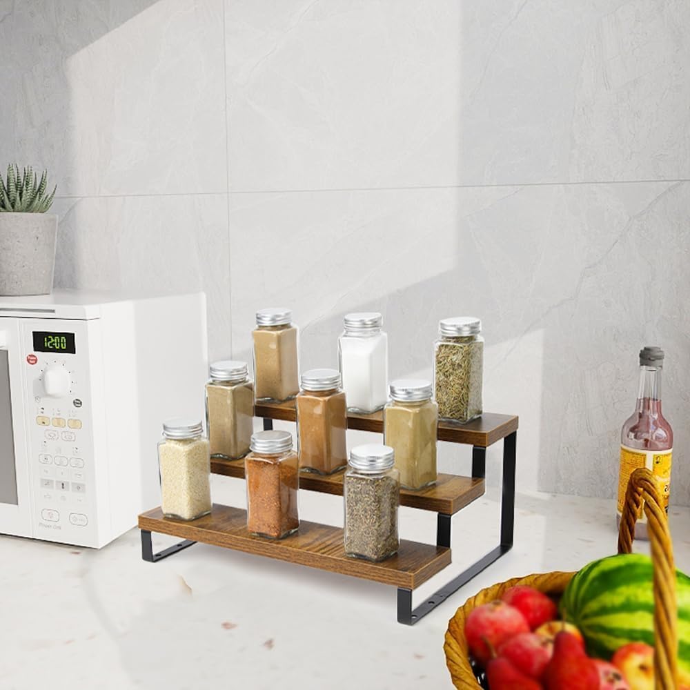4-Tier Wooden Display Riser Shelf Stand for, Makeup, Cupcake, Condiment & Dolls Collection Home Decor Organizer, Expandable for Pantry/Counter (Brown, 3-Tier)