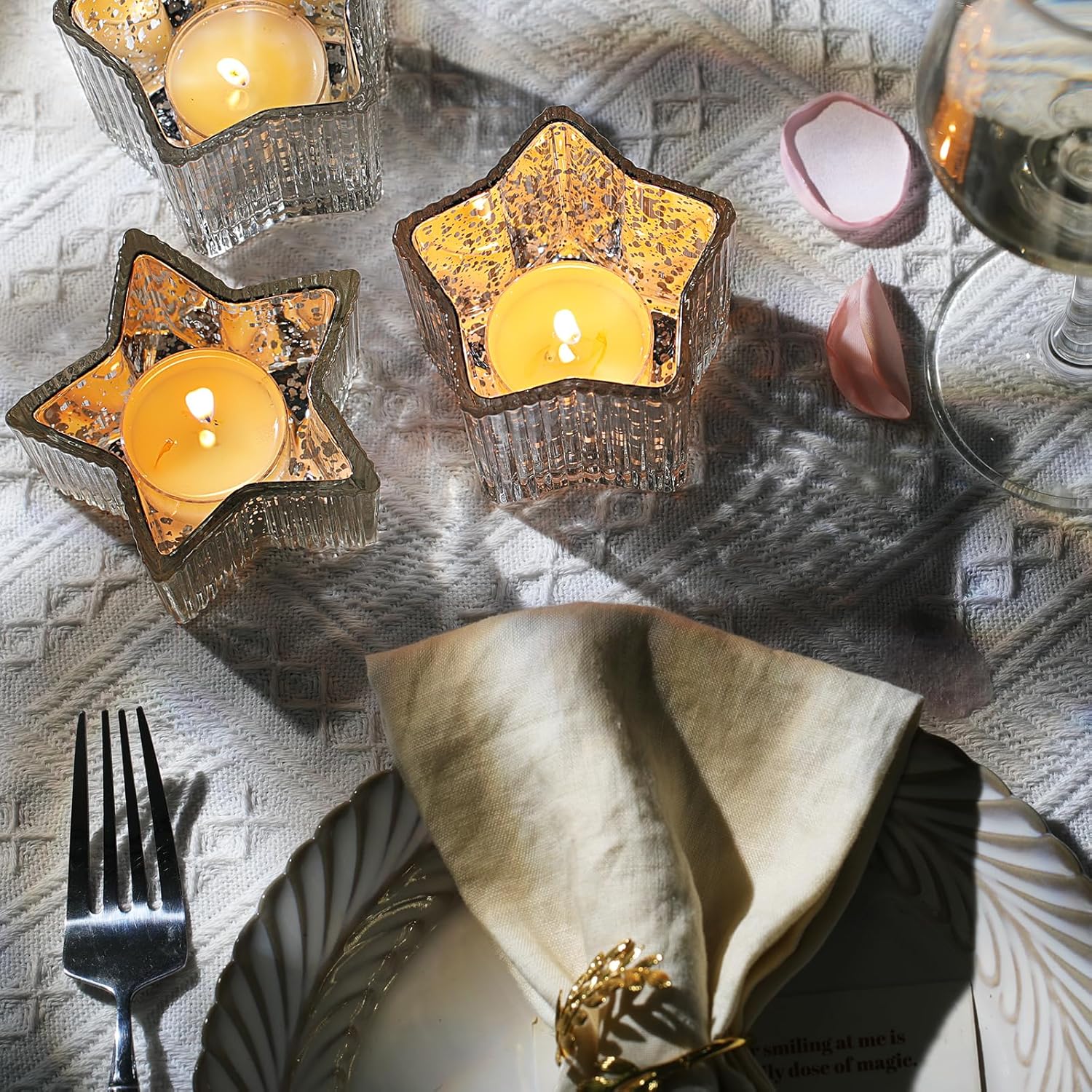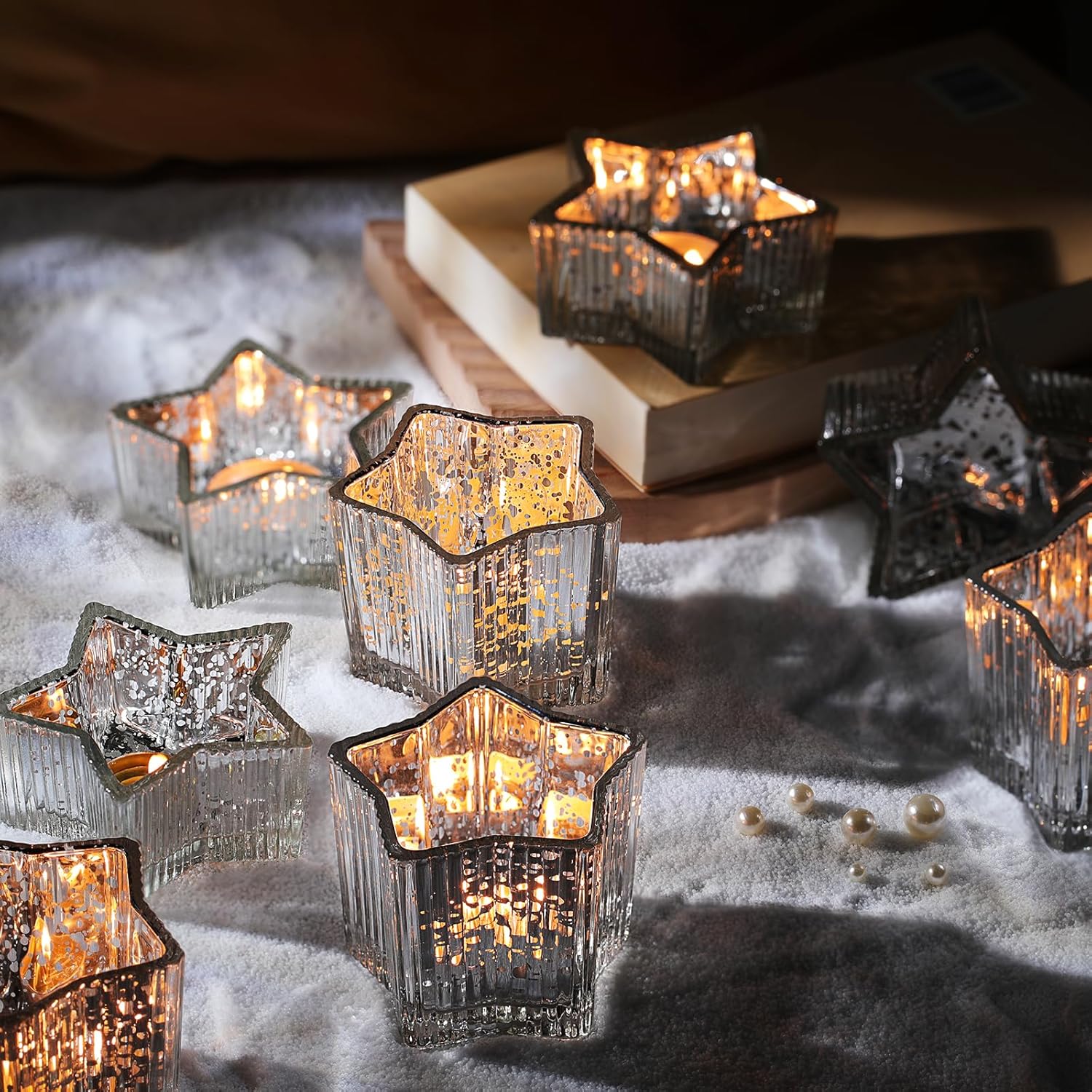 - Elegant silver-Plated Star Candle Holders – This set of 10 votive candle holders features a stunning silver-plated finish with a vertical star design, perfect for creating a warm, celestial glow with tea lights candle holders or flameless LED candles.