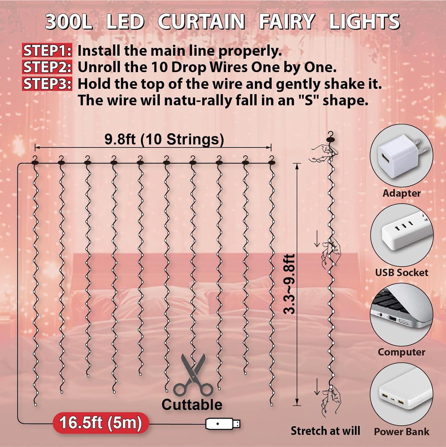 - 16.5ft Lead wire: 300 individual LEDs, 9.8ft.x9.8ft curtains lights come with extra 16.5ft long power cord. 9.8ft main strand and 10 drop strings included hooks. Copper wire drop strings is tough & flexible, hanging & adjustable desired height naturally easily. No limits to your imagination, Do the shape you like. Enjoy a fairytale world ( Curtain is NOT included)