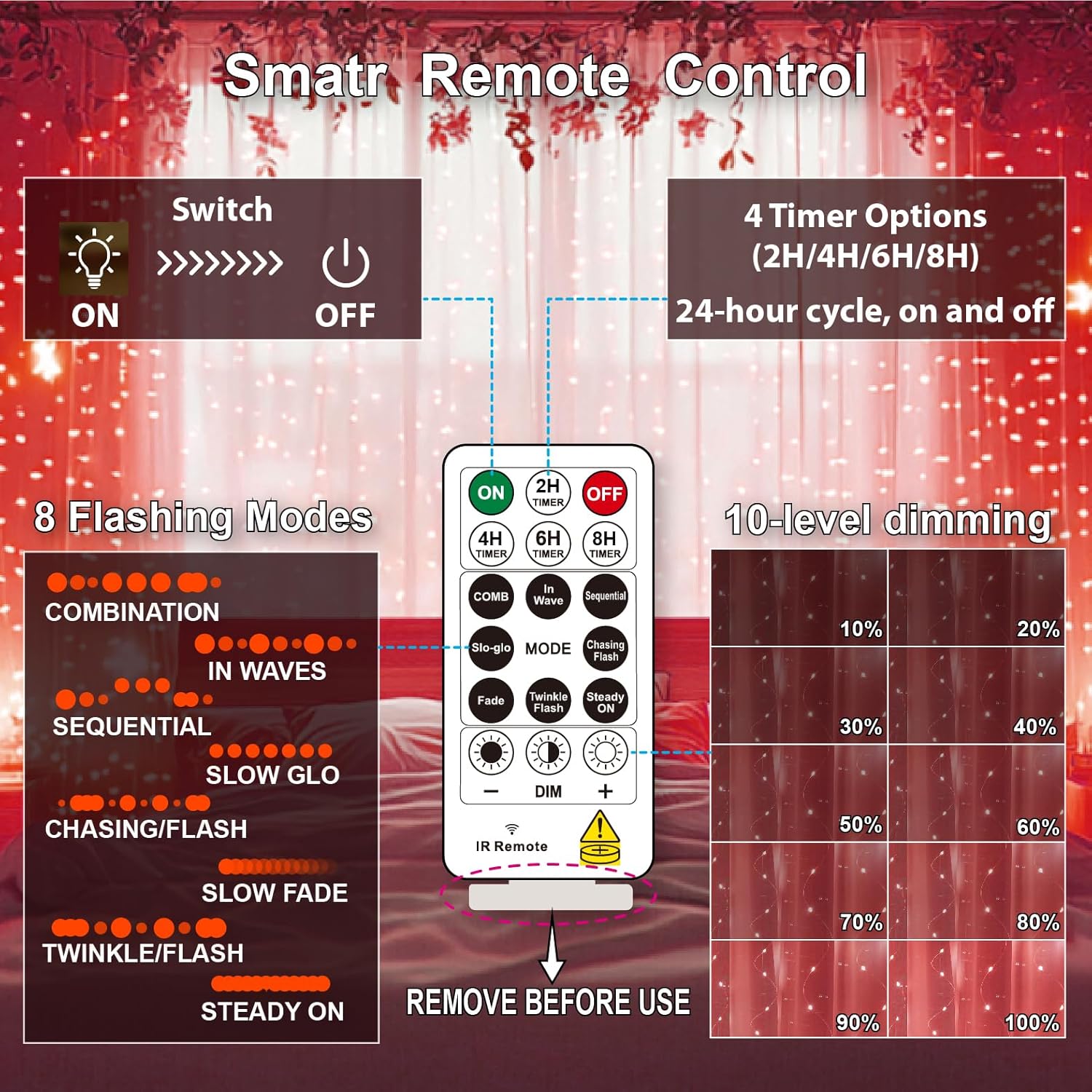 HXWEIYE 300LED Fairy Curtain Lights, 9.8x9.8Ft USB Plug-in 8 Modes Christmas String Hanging Lights with Remote for Bedroom Backdrop Wedding Party Indoor Wall Decor, Red