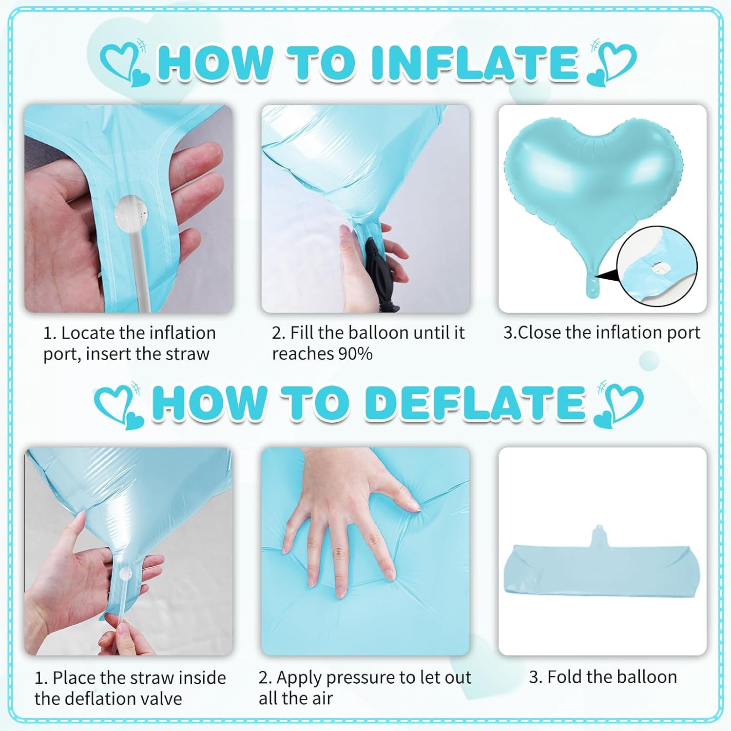 - Easy to Use - Effortlessly inflate our heart shaped foil balloons using the included straw. (If you want a floating effect, you can use helium)Simply pinch the self-sealing valve when full. It can be easily hung on the wall, ceiling or balloon garland, and it looks more advanced as a photo-taking tool!
