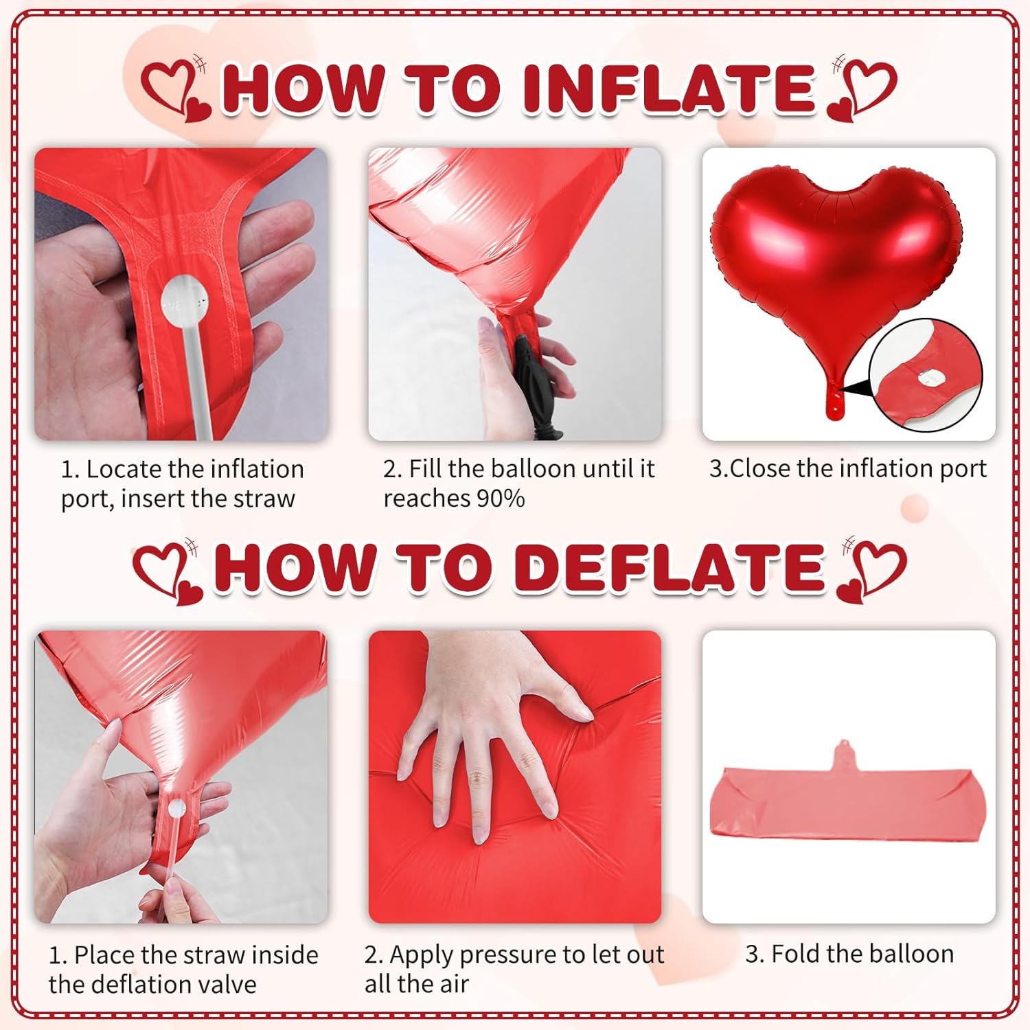 - Easy to Use - Effortlessly inflate our heart shaped foil balloons using the included straw. (If you want a floating effect, you can use helium)Simply pinch the self-sealing valve when full. It can be easily hung on the wall, ceiling or balloon garland, and it looks more advanced as a photo-taking tool!