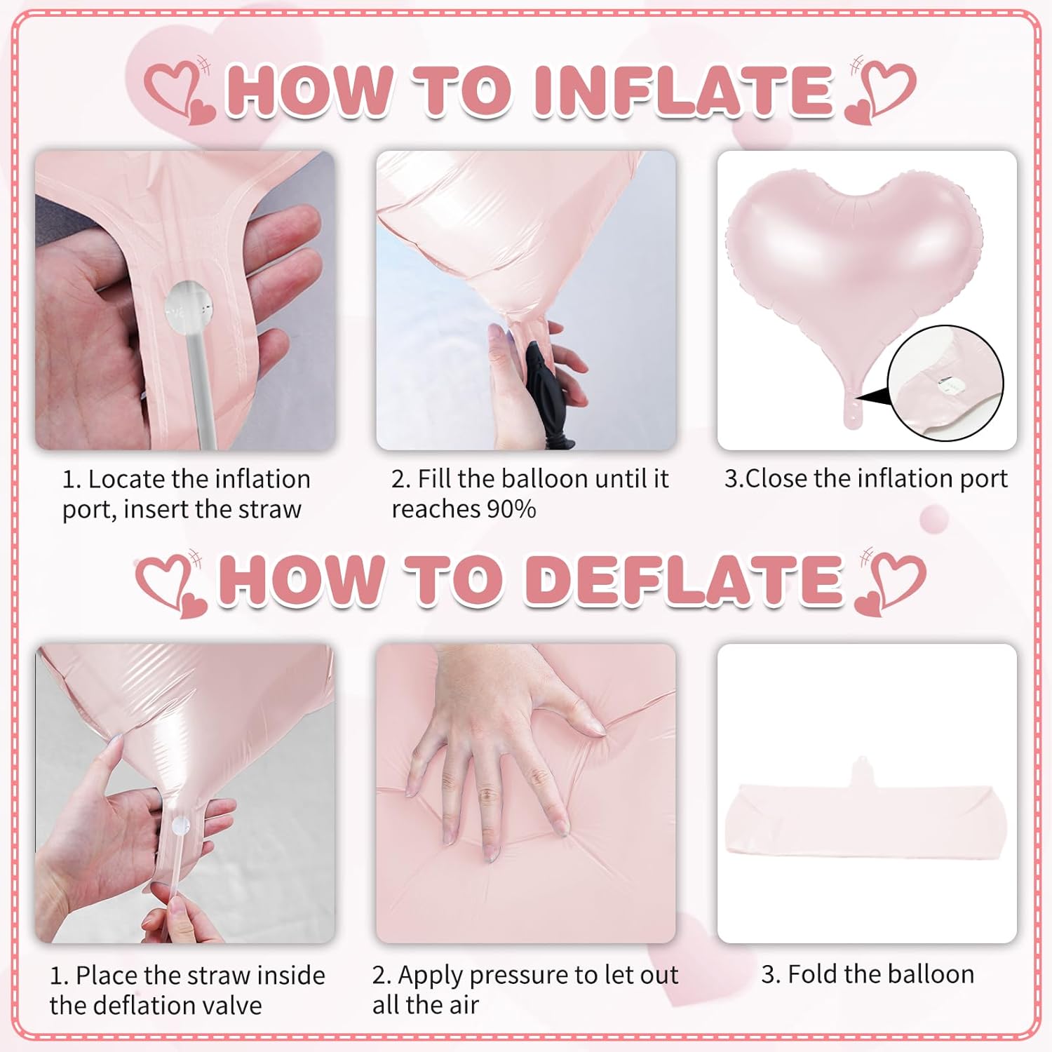 - Easy to Use - Effortlessly inflate our heart shaped foil balloons using the included straw. (If you want a floating effect, you can use helium)Simply pinch the self-sealing valve when full. It can be easily hung on the wall, ceiling or balloon garland, and it looks more advanced as a photo-taking tool!