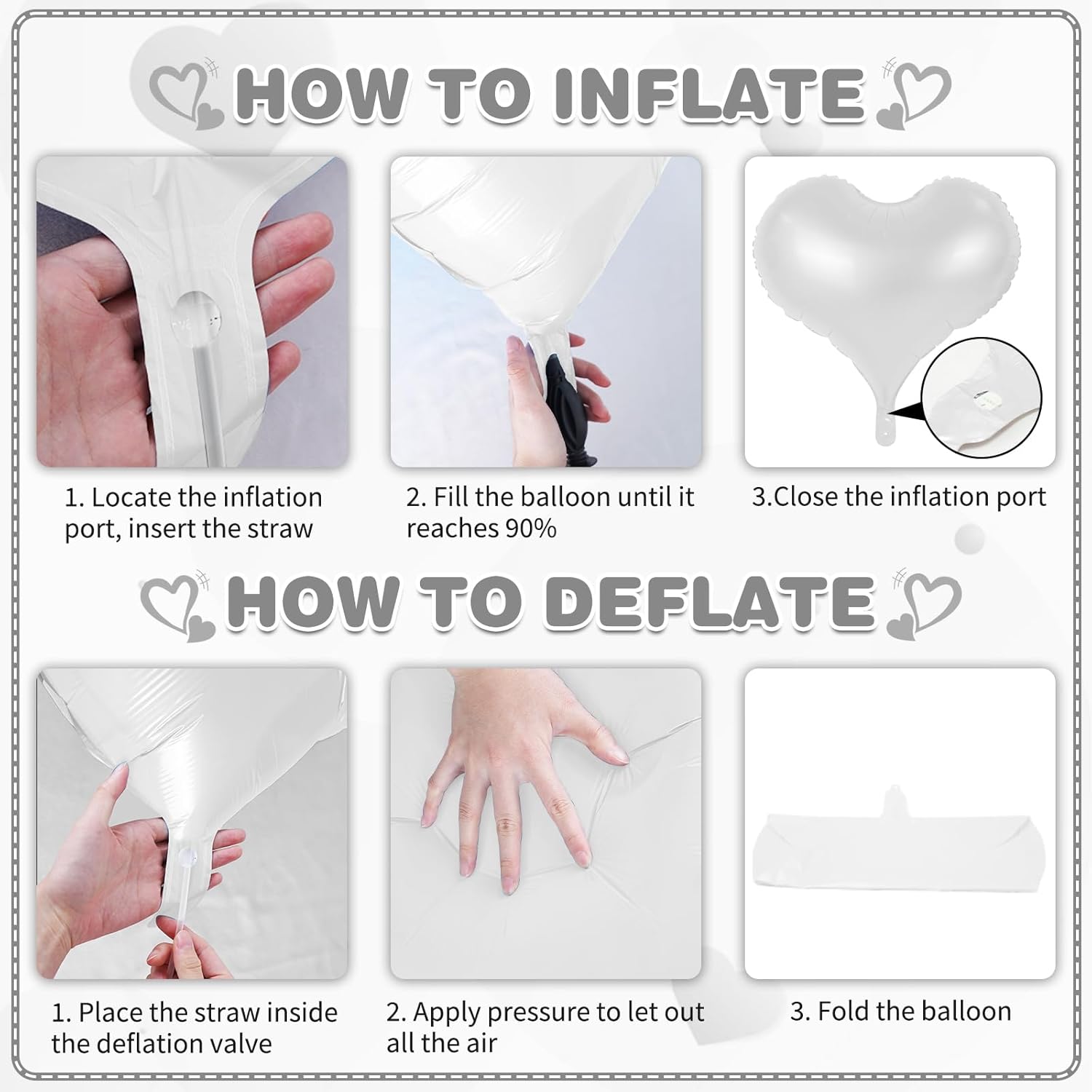 - 24 Inches Heart Balloons - Package contains 6 pcs white heart balloons, 1pc straw and 1pc ribbon.The white heart shaped balloons are ideal for any party. 24 inch is big and special enough to decorate your party.