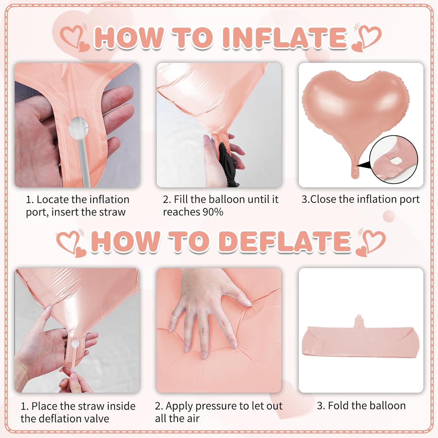 - Easy to Use - Effortlessly inflate our heart shaped foil balloons using the included straw. (If you want a floating effect, you can use helium)Simply pinch the self-sealing valve when full. It can be easily hung on the wall, ceiling or balloon garland, and it looks more advanced as a photo-taking tool!
