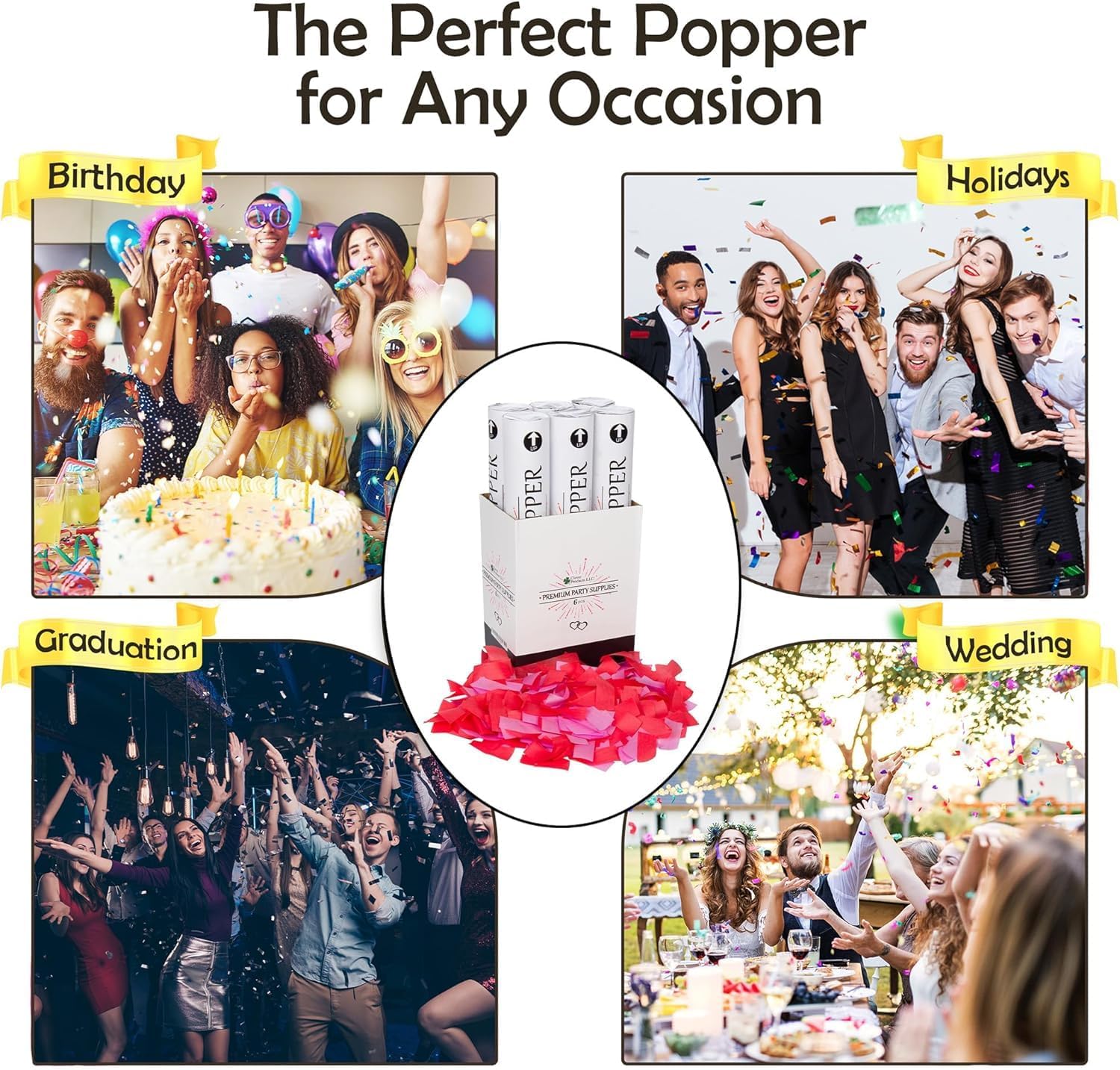 - MAKE EVERY CELEBRATION LEGENDARY Each biodegradable 12" confetti cannon unleashes a stunning burst of vibrant red and pink confetti—ideal for unforgettable moments and picture-perfect parties. Captivate your guests and elevate your event’s energy with every pop
