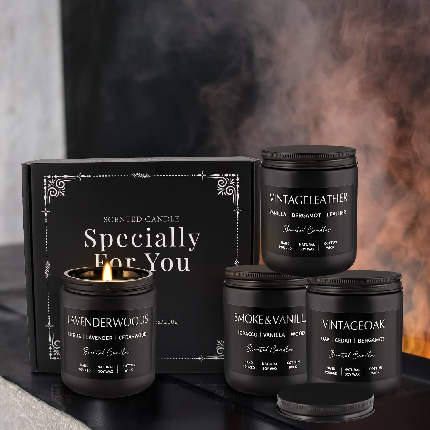 4Psc Scented Candles Set,7oz Gifts for Men Aromatherapy,Soy Candle of Smokeless - Leather & Smoke, Vanilla Oakmoss, Lavender - Relaxing Fragrance for Home, Office, Yoga(Black)