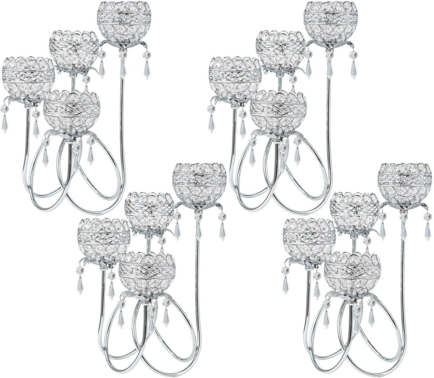 4 Arms Crystal Candelabra Tealight Holder - Tall 15.7 Inch Elegant Centerpiece with Crystal Pendant Bowls & Artistic Metal Stand for Wedding, Dining Table, Home Decor (4, Silver)