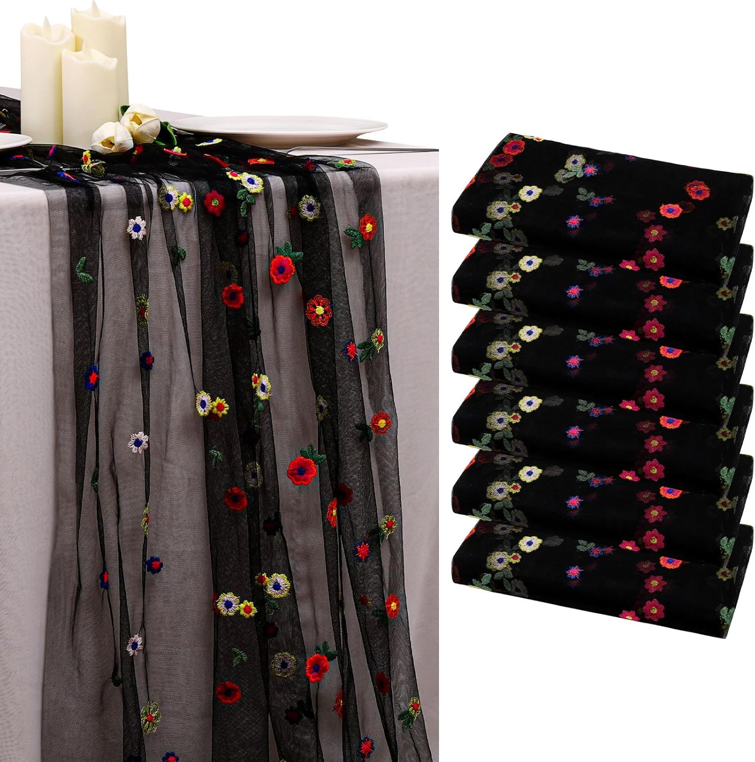 BINBE 6pcs Black Daisy Fall Table Runner Embroidery Gauze 10FT Florals Seasonal Tulle Holiday Birthday Kitchen Dining Table Decor for Home Party
