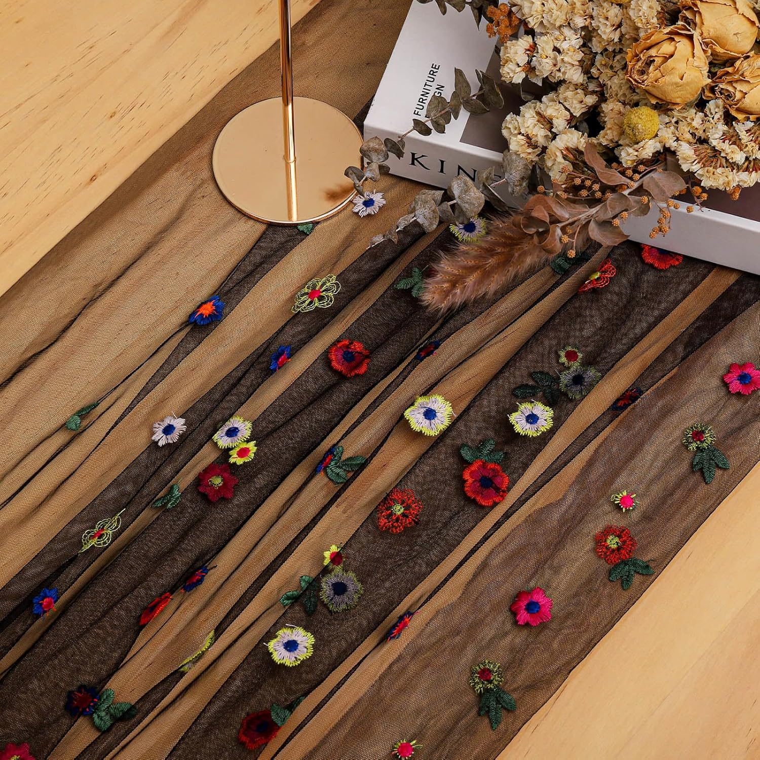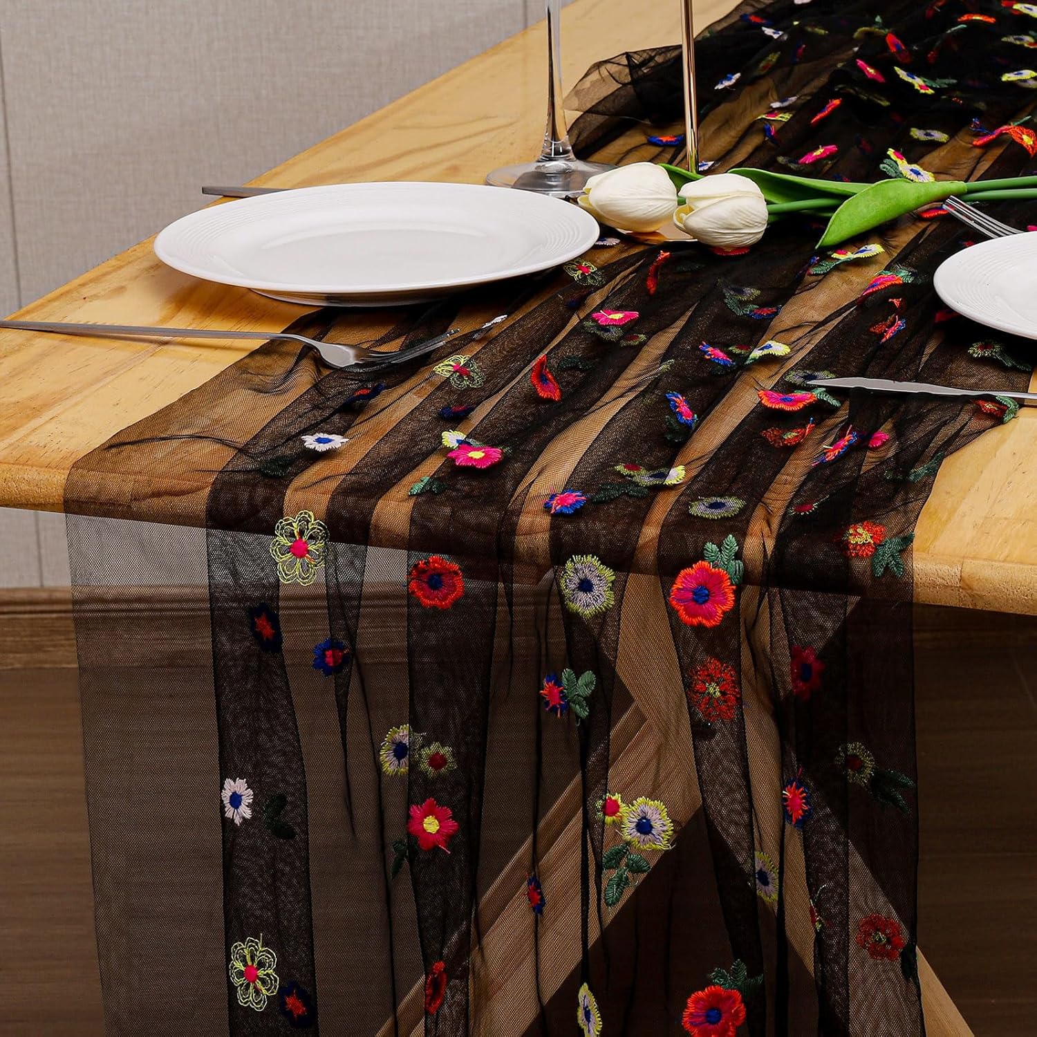 BINBE 3pcs Black Daisy Fall Table Runner Embroidery Gauze 10FT Florals Seasonal Tulle Holiday Birthday Kitchen Dining Table Decor for Home Party